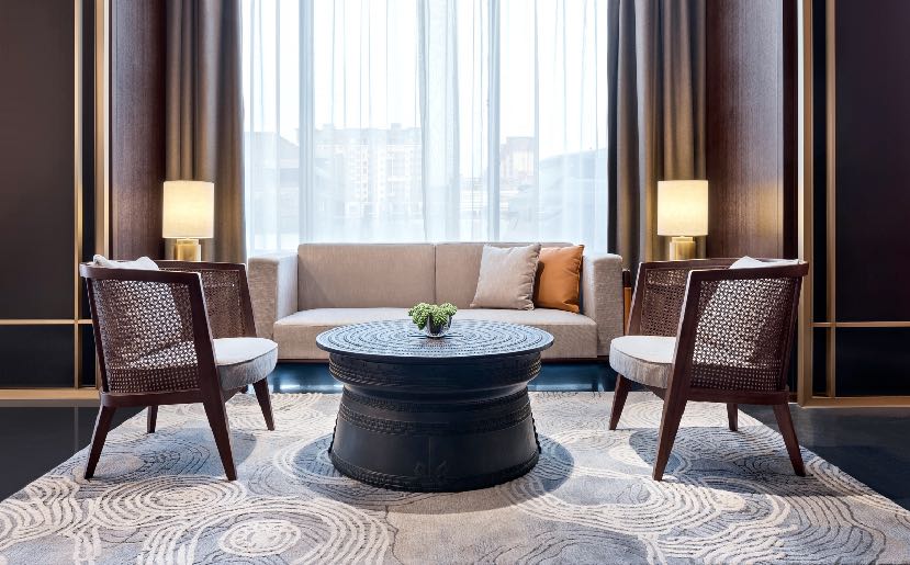 中深建:我们始终相信,每一间酒店都是独一无二的。挖掘酒店的独特性,让它落地生根、与本土环境完美融合是我们需要解决首要问题。Tulip Inn 的特殊之处在于,首先它周边的业态还在建设完善中,空间布局存在硬伤,人流动线、后勤动线需要重新梳理:酒店入口、客人如何去各个空间、宴会厅如何独立运营等。其次,作为一个境外品牌的本土化,一定要结合运营思维和本土人文作出调整。在设计上,我们重新演绎了法式文化的内涵,并结合黔西南文化符号作进一步延伸,突出艺术、优雅与时尚融合的空间气质。