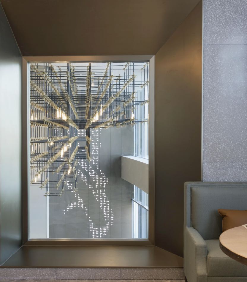 大堂空间并不开阔,但有一定的挑高。设计师打造了一个LOFT式的内立面,将LOFT的精髓复兴在都会宅邸的气度中,通透而高低错落的玻璃橱窗,将整体纯白空间的重心上提,点缀在几何架构的装置中的袅袅光影,营造出优雅的轻盈感。