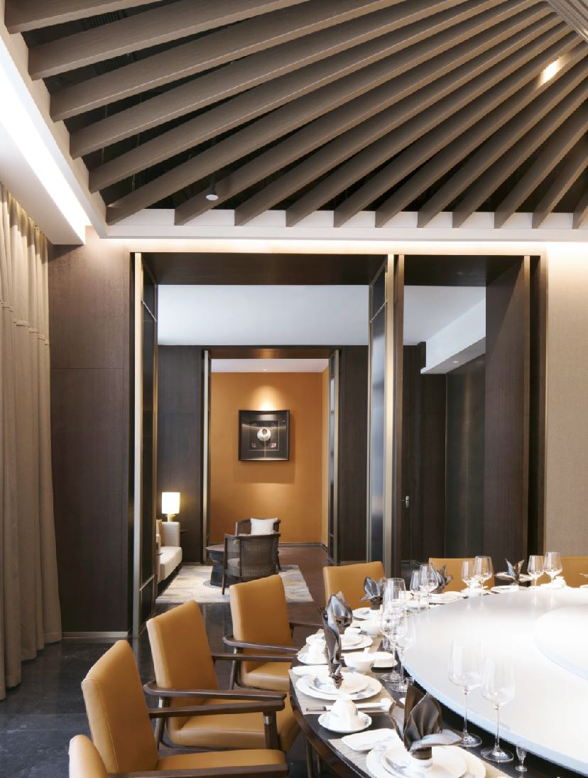 建筑方面,是以整个综合体为中心轴,所以出现了部分空间需要让出消防环形车道,这部分刚好将酒店分割成两部分。但我们利用这个缺陷,将中餐厅进行重新定位,以成熟的连锁餐饮商业模式代入酒店,又与商业部分的主体餐饮进行区分,形成差异化经营、客源互补,共同盈利。