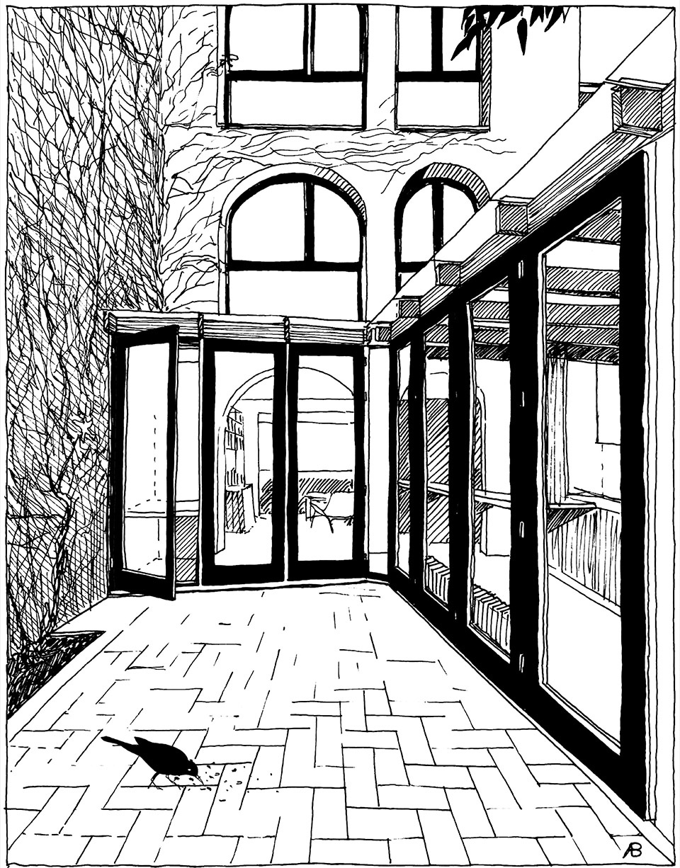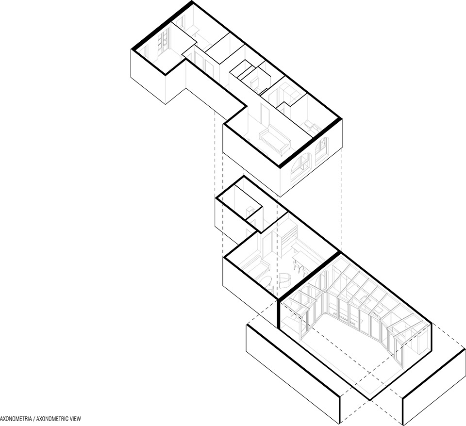 扩建部分的立面脱离了原有建筑的垂直线条,解放了原本封闭室内空间的两个拱门,这两个拱门现在作为客厅、餐厅与新建的走廊(包含厨房和书房)之间的过渡。通过分离立面,新扩建部分的外壳摆脱了原建筑的约束,并进行了一些微小的弯曲,这样可以在活动频繁的区域(无论是室内还是庭院)创造更多的空间。