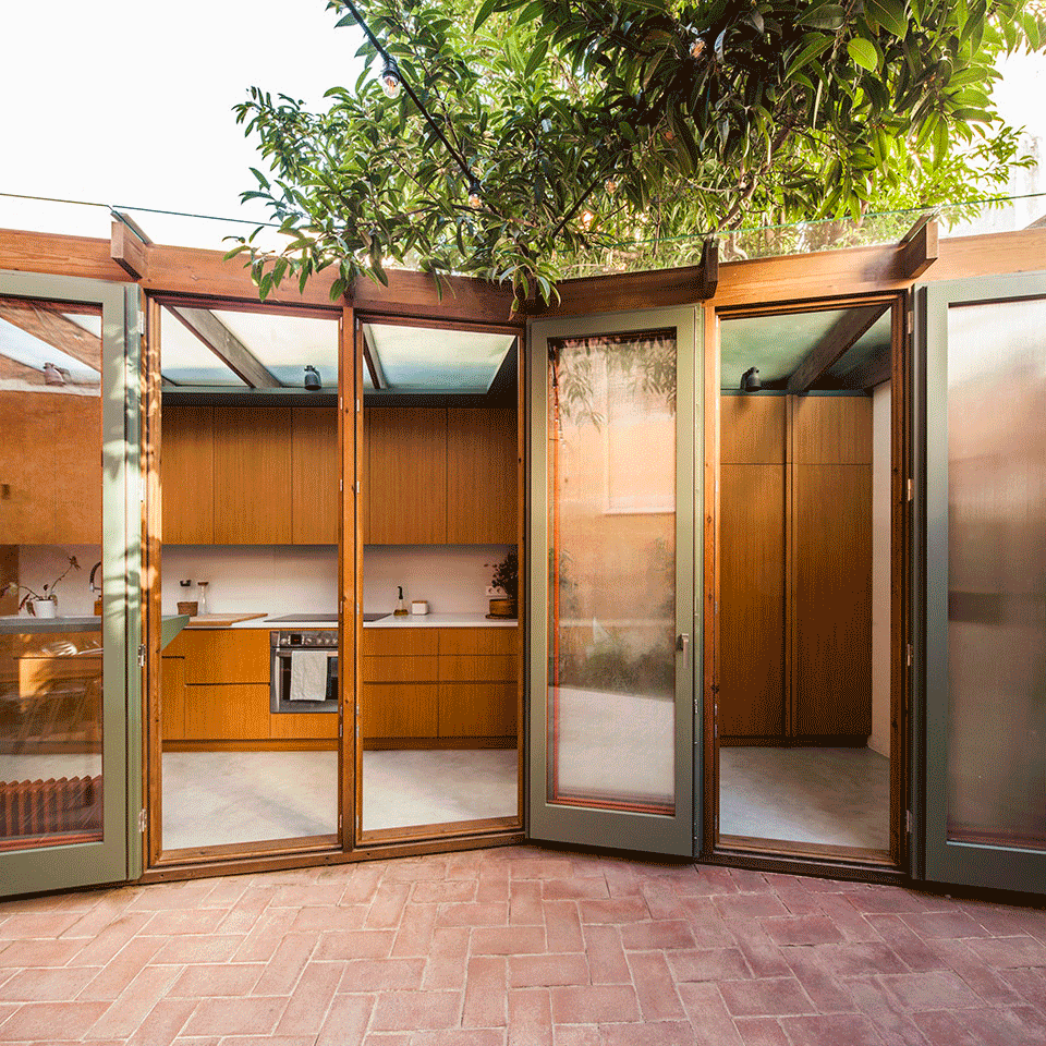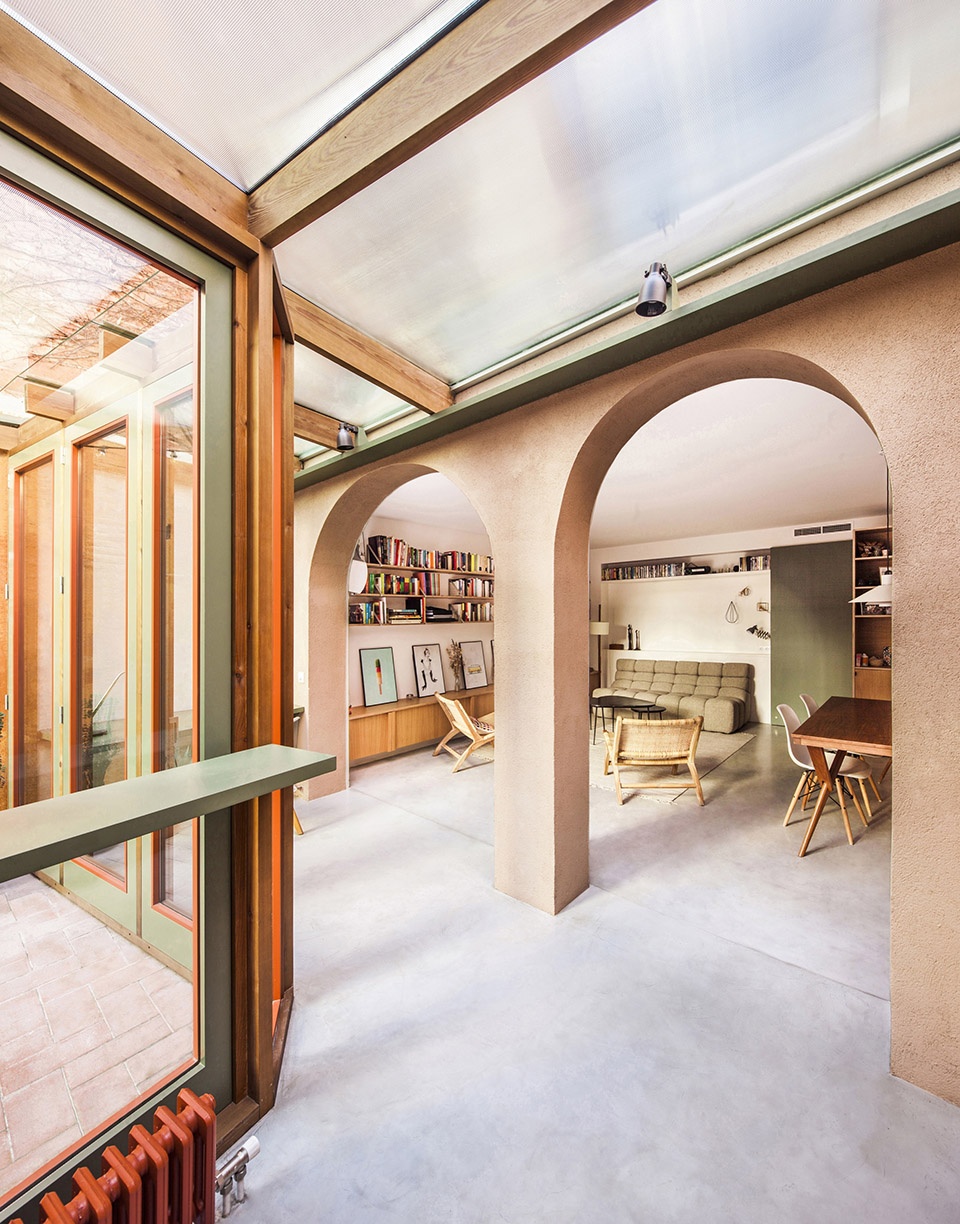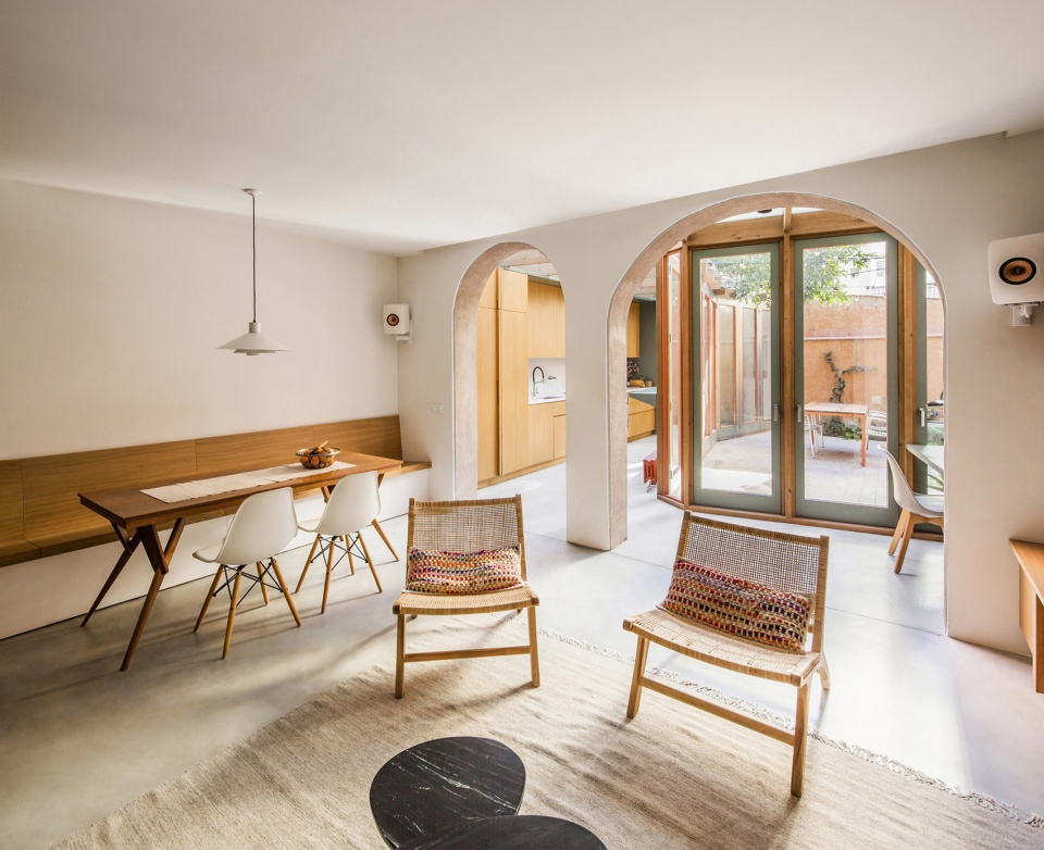The new façade of the extension is detached from the vertical line of the property, freeing the two arches that originally enclosed the interior space and that now act as a transit between the living-dining room and the new gallery with the kitchen and study. By separating the façade, the new envelope is freed from the guidelines of the existing building, making small inflections that allow more space in the areas of more activity, both inside and in the patio.
