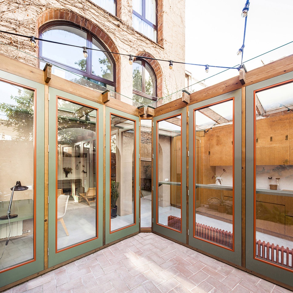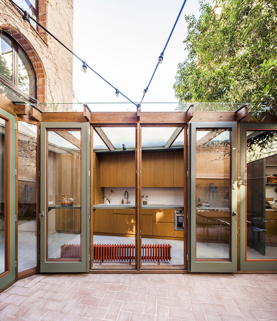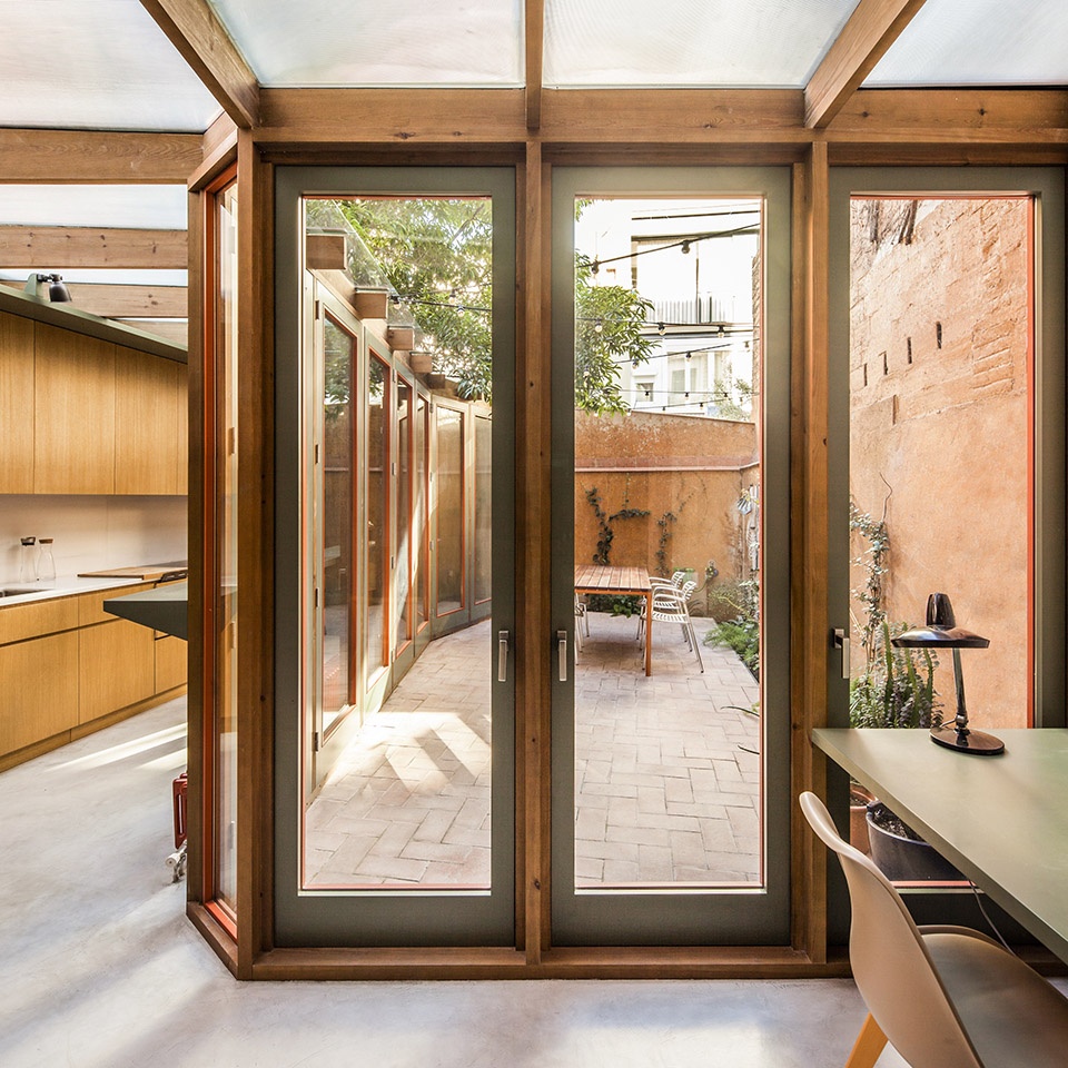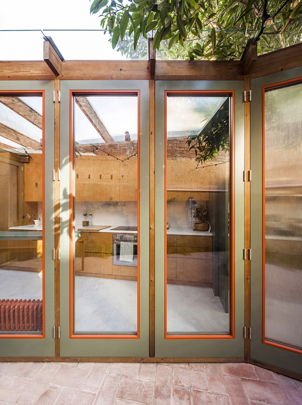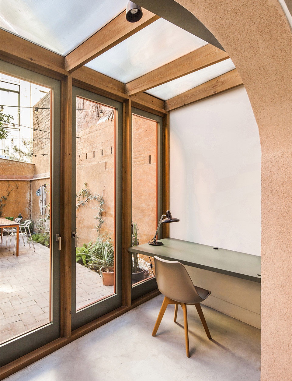 The new volume is made with a structure of wood and glass, like a greenhouse, in a location where there is never a big insolation due to the shadows of the building itself and the neighboring ones. On the other hand, the addition being such a transparent piece, we ensure that the rest of the ground floor continues to enjoy natural light.