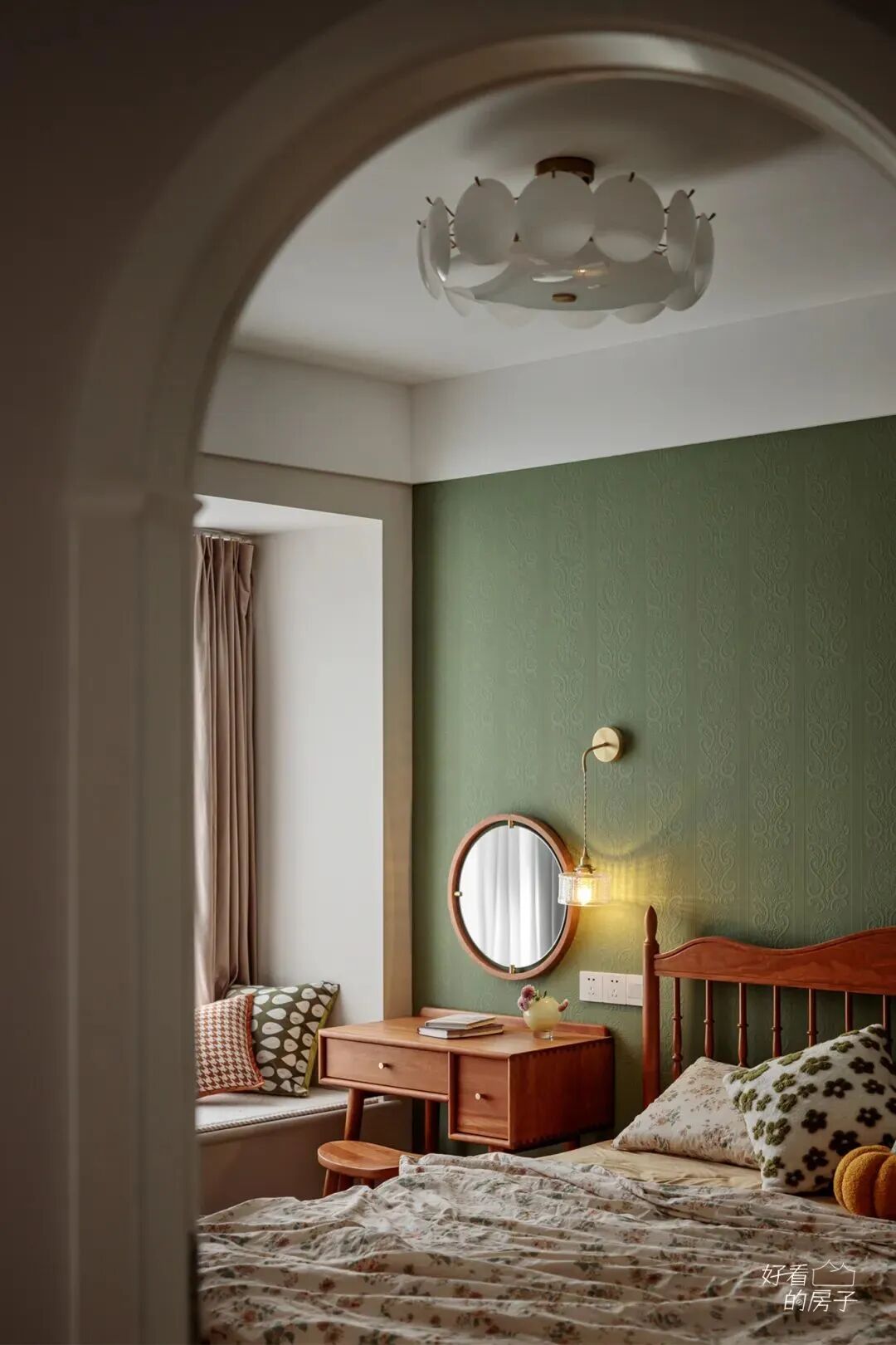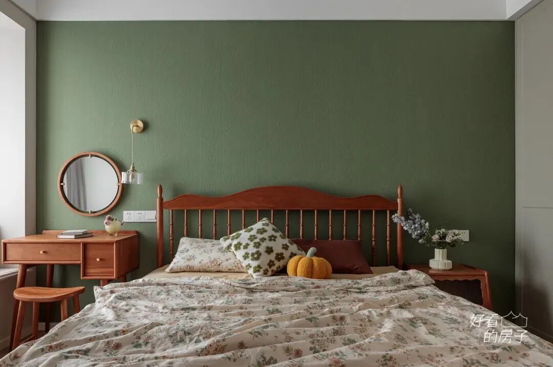 卧室注重外表、功能、氛围的结合,使用生机盎然的雪松绿堆砌出空间的基础色彩,樱桃木材质的复古床以及梳妆台、边几,共同融为与空间一体的室内装饰。