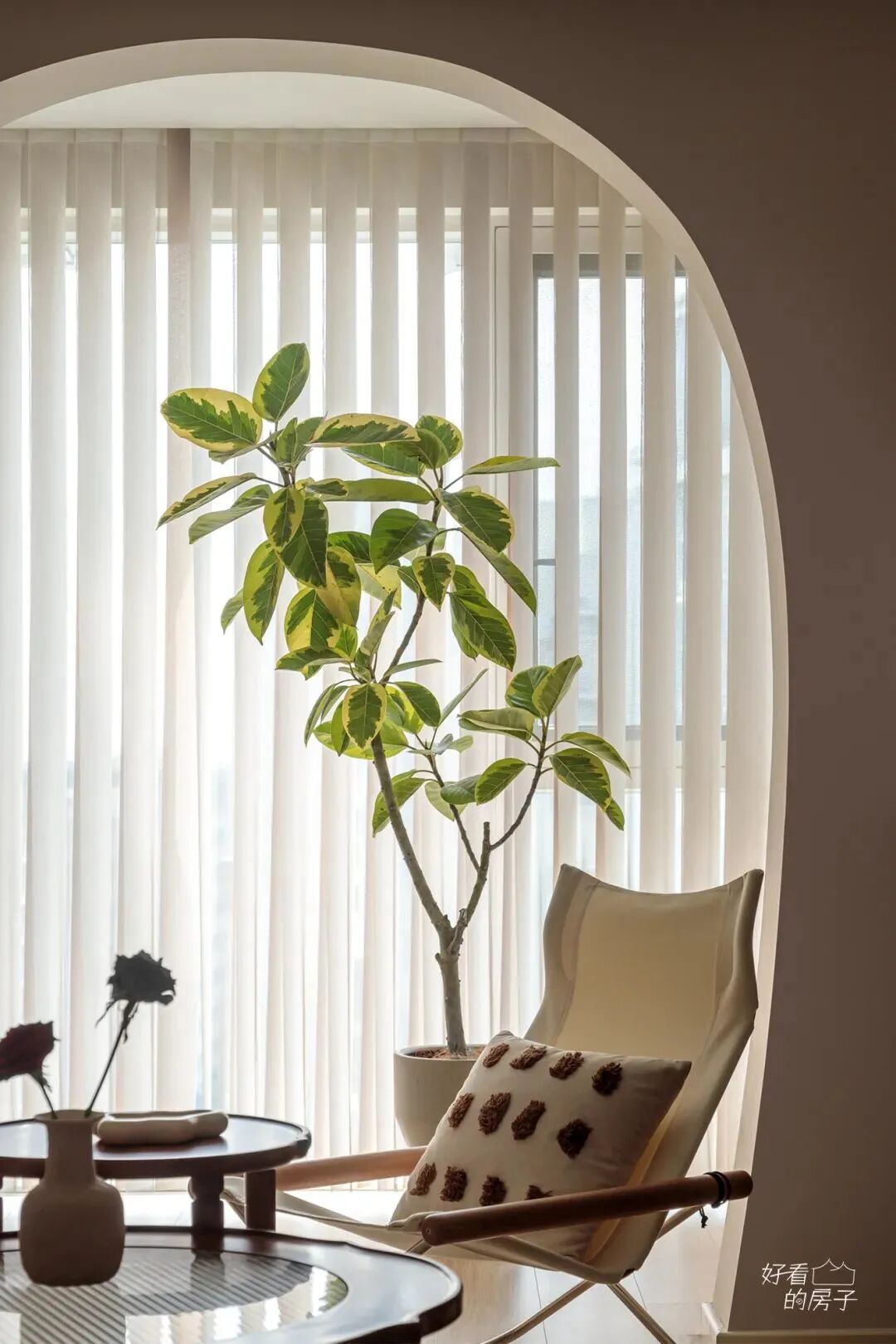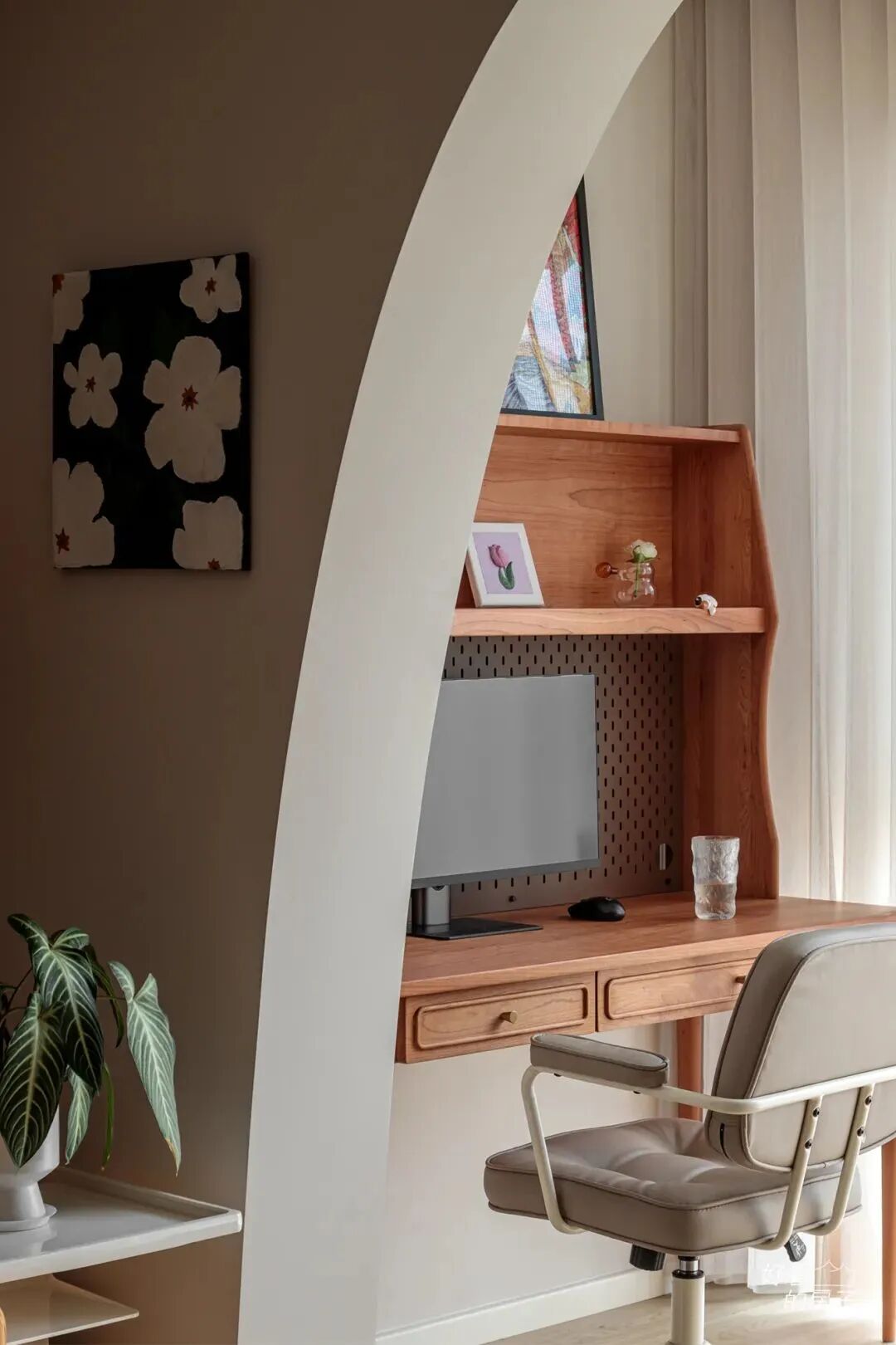 封闭式阳台除了落地玻璃窗以外,还可以考虑将其打造成有造型的门洞等等,丰富空间的表现形式和功能性。本案中的小歪拱门,不影响采光,也更具趣味性。