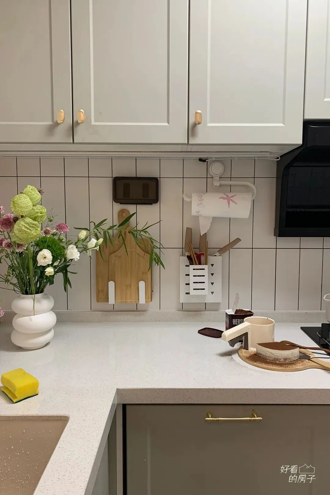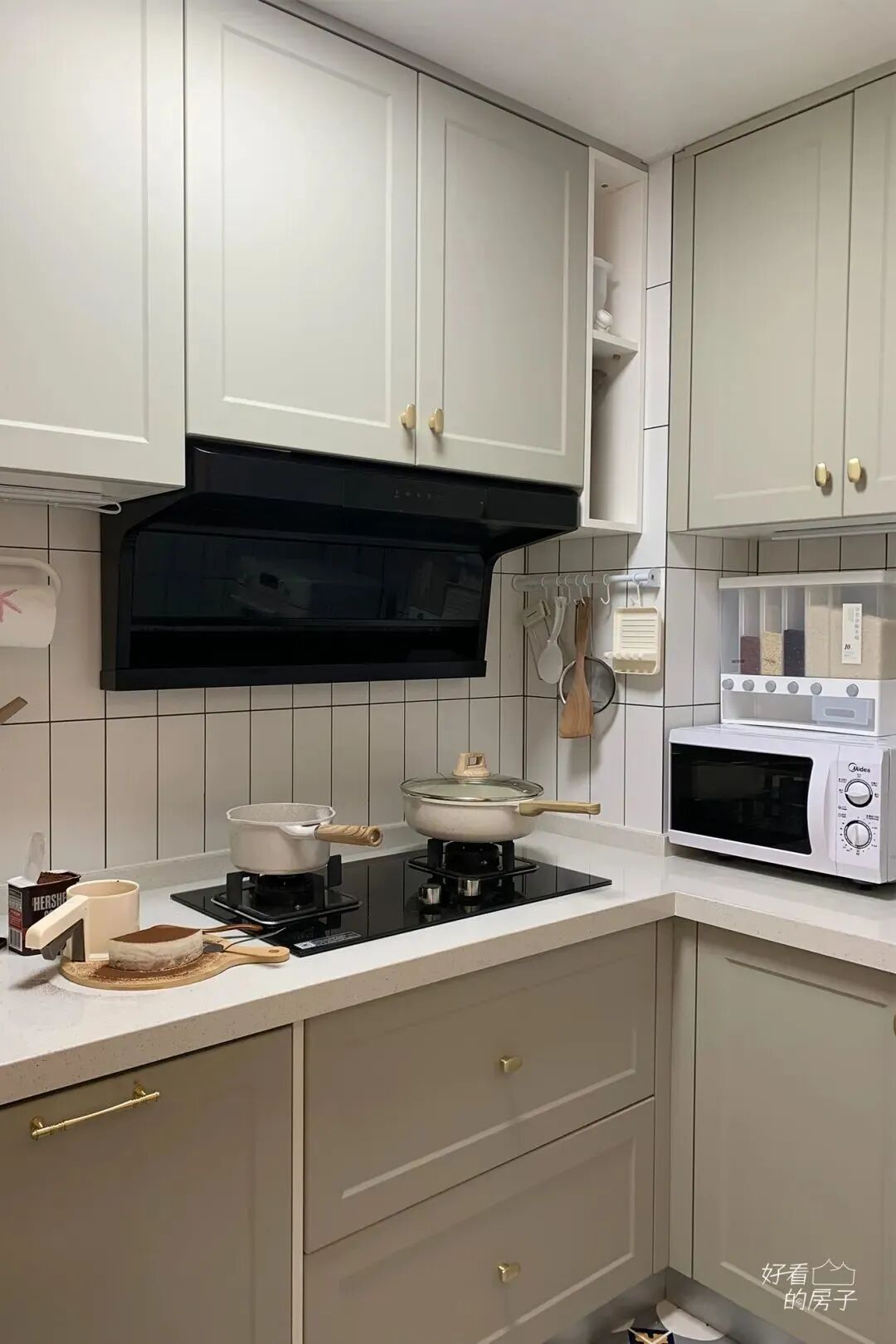 ○由于厨房侧墙为承重无法拆除,冰箱放置在内凹夹角,借用视觉差让厨房+冰箱整体看起来在一个空间维度,尽可能保持动线顺畅