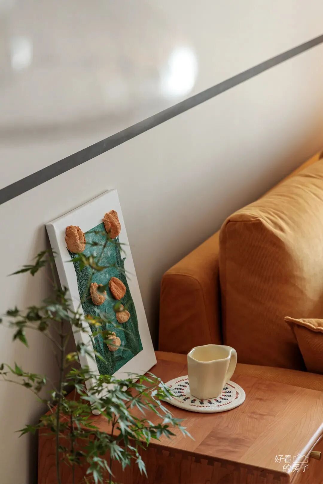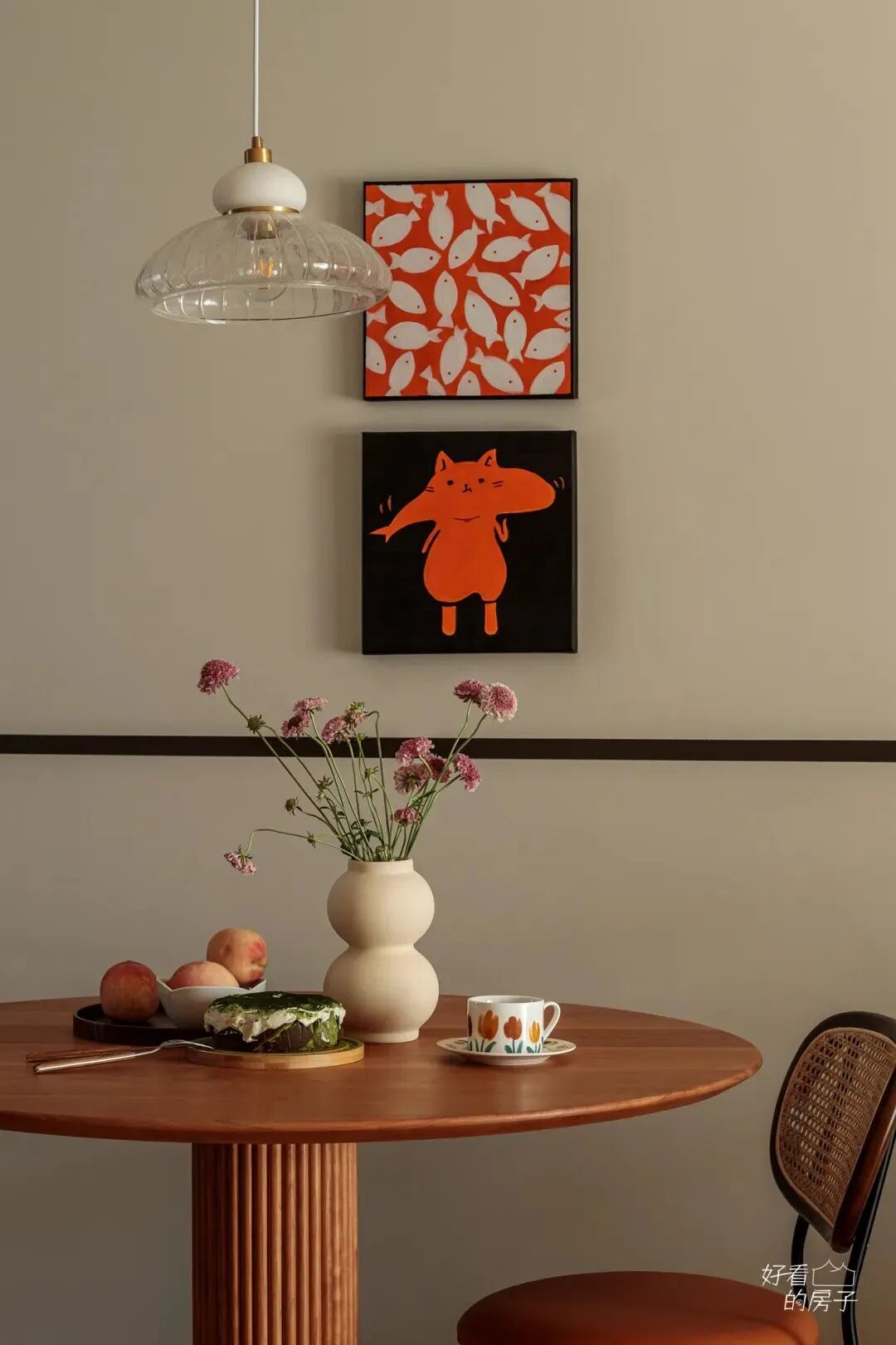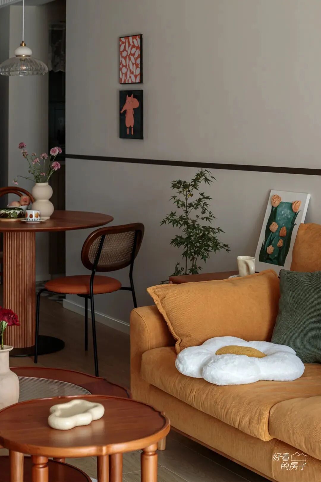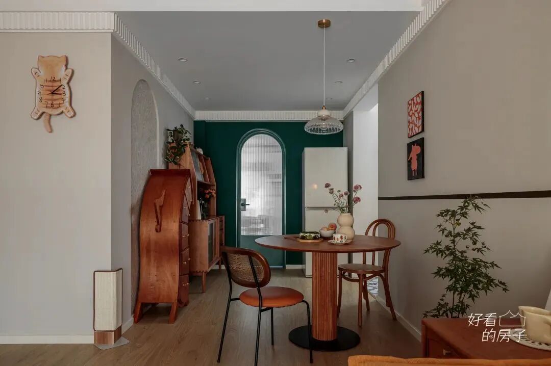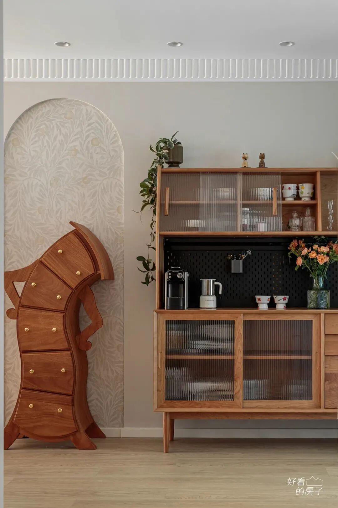 在原本的餐厅位置,摆放两个成品柜,一个造型独特有趣,可以摆放一些不希望被展示的物件;而zakka风的餐边柜,既可以收纳又能很好的展示拥有的瓶瓶罐罐餐具杯碟,一眼就能被充满烟火气的场景吸引。