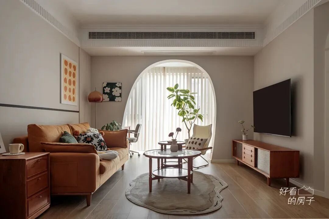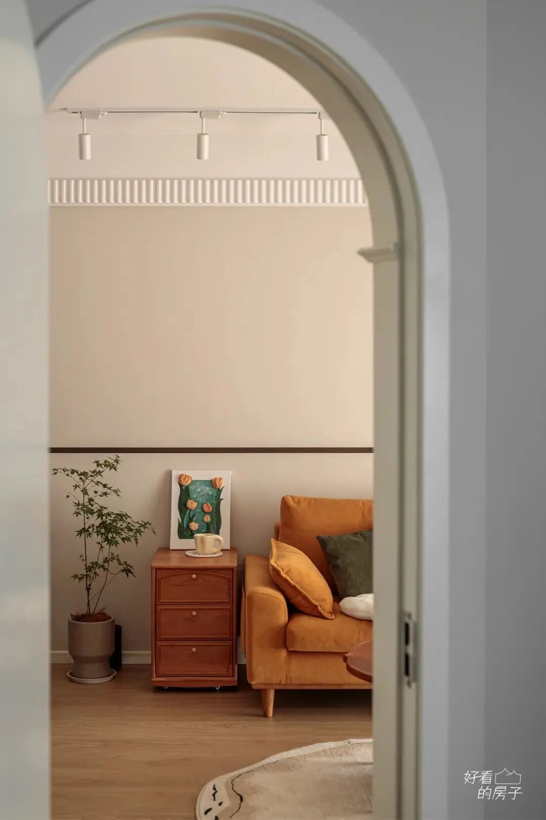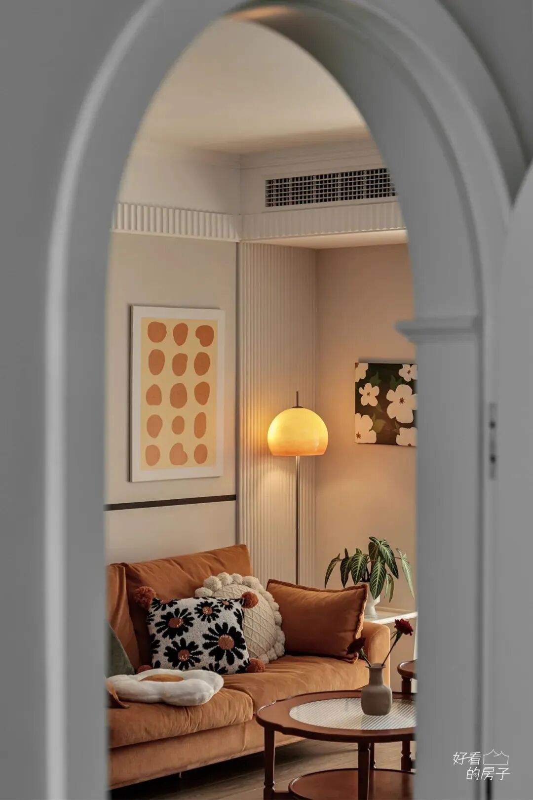 客厅拆掉原推拉门后,做了不规则的圆弧形“小歪拱门”。采光好,视线阔,空间更通透明亮。