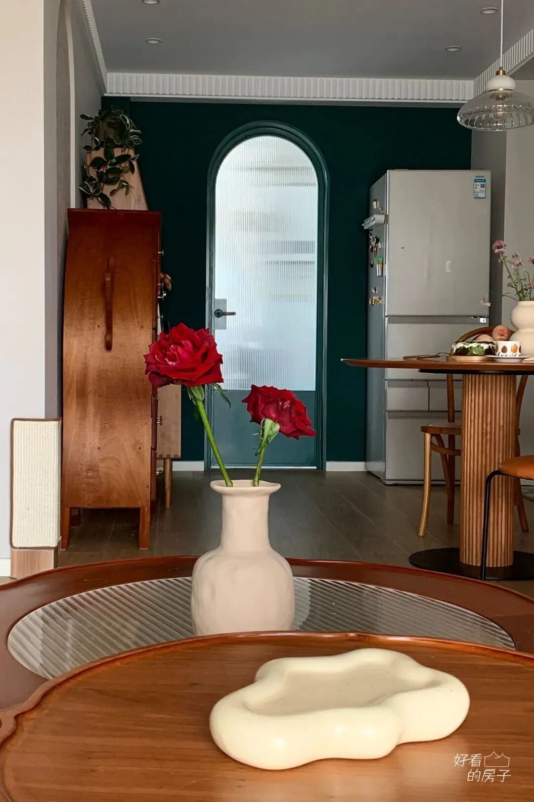 推拉门之外,根据屋主生活需求保留了生活阳台。墙面粉刷浓郁的森林绿,搭配拱形门洞,透光不投影的圆弧长虹玻璃,让这个角落极美观,又神秘。