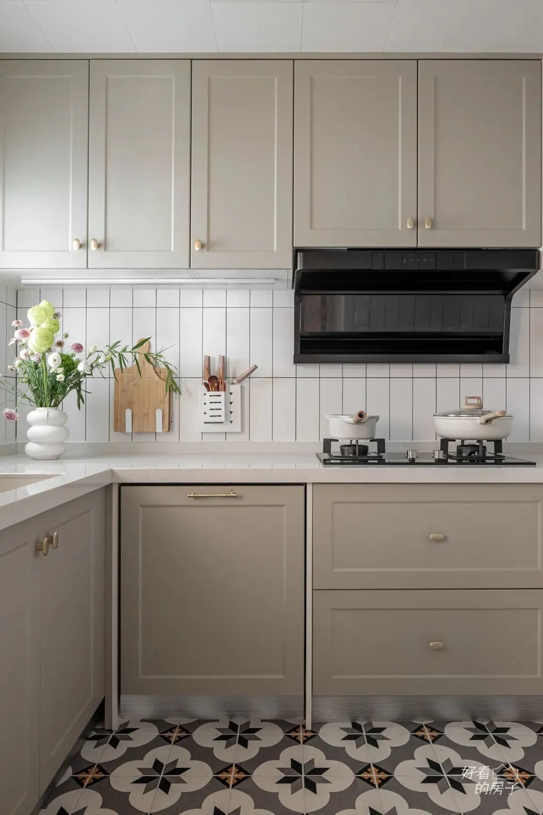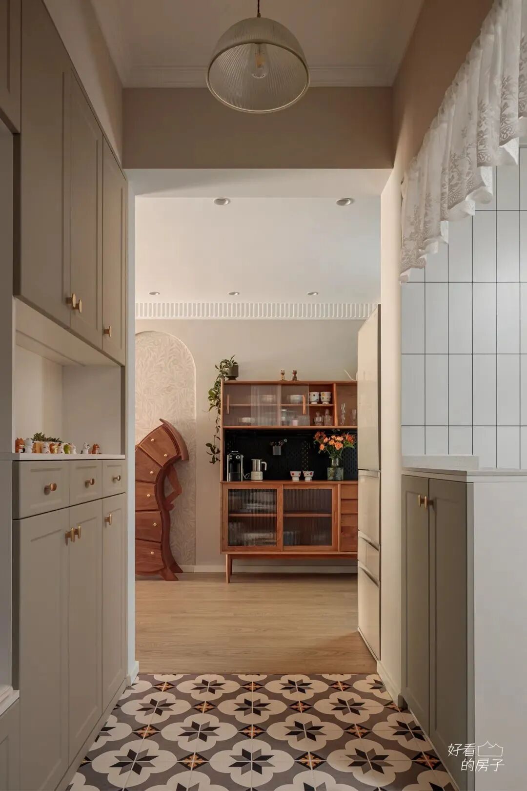 借用日式“落尘区”概念,玄关和厨房采用了复古花地砖,和客厅的木地板做功能区分。