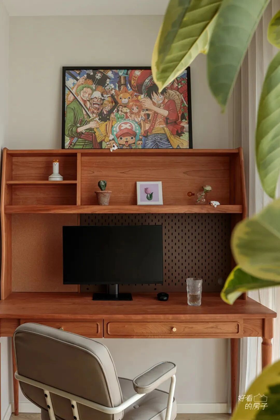 阳台纳入客厅空间合并使用,呈开放空间。办公兼游戏位也挪到这里,有阳光、有植物,随时可以看窗外风景。累了,就坐在躺椅上喝茶~