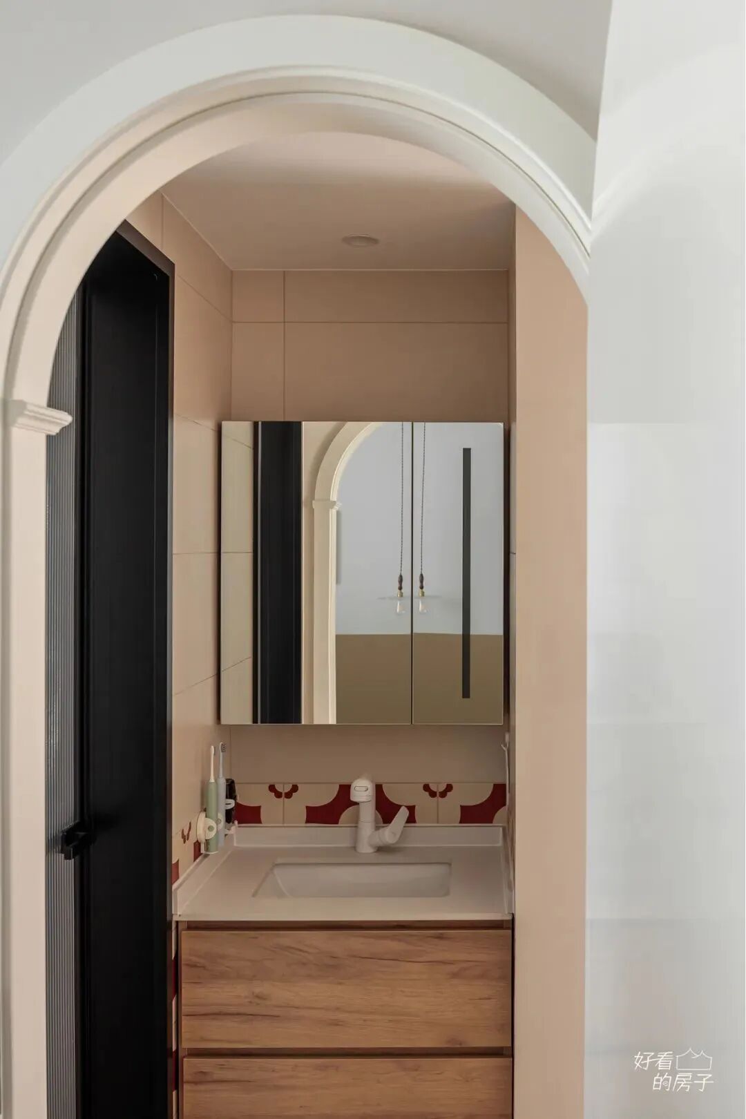这里同样设计了斜切拱门,没有太多传统的方正框架,整体搭配起来,空间和谐又舒适。