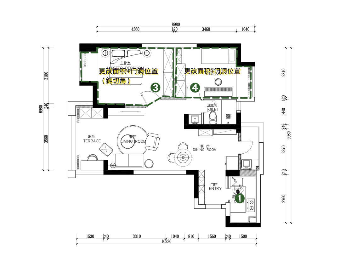 ○拆掉厨房隔墙,做成开放式;用吧台替代半墙,既能增加储物又能和玄关左侧鞋柜呼应