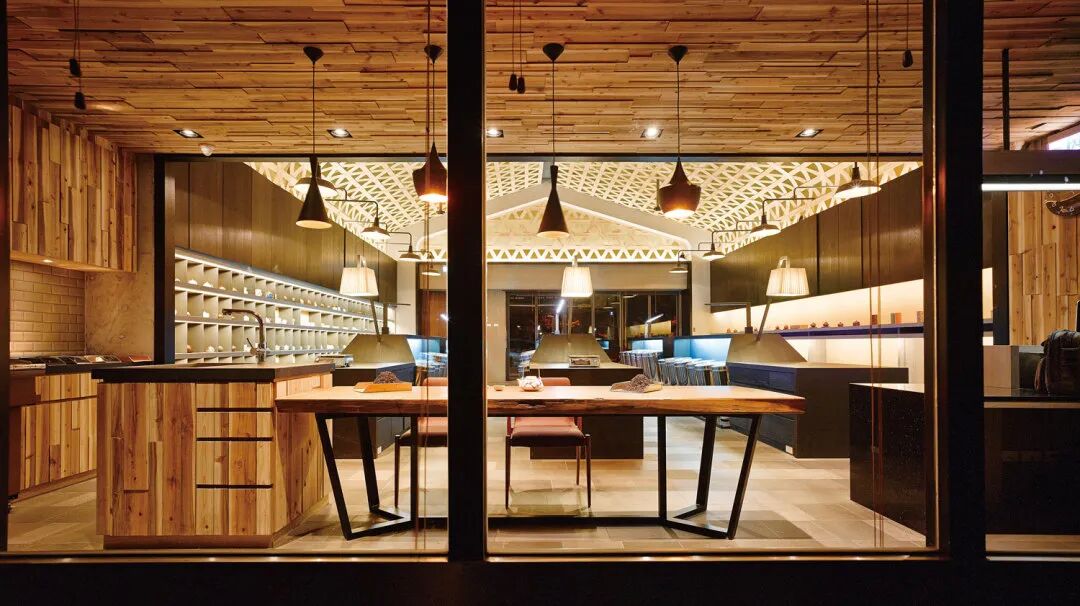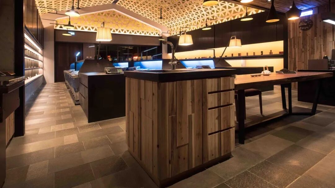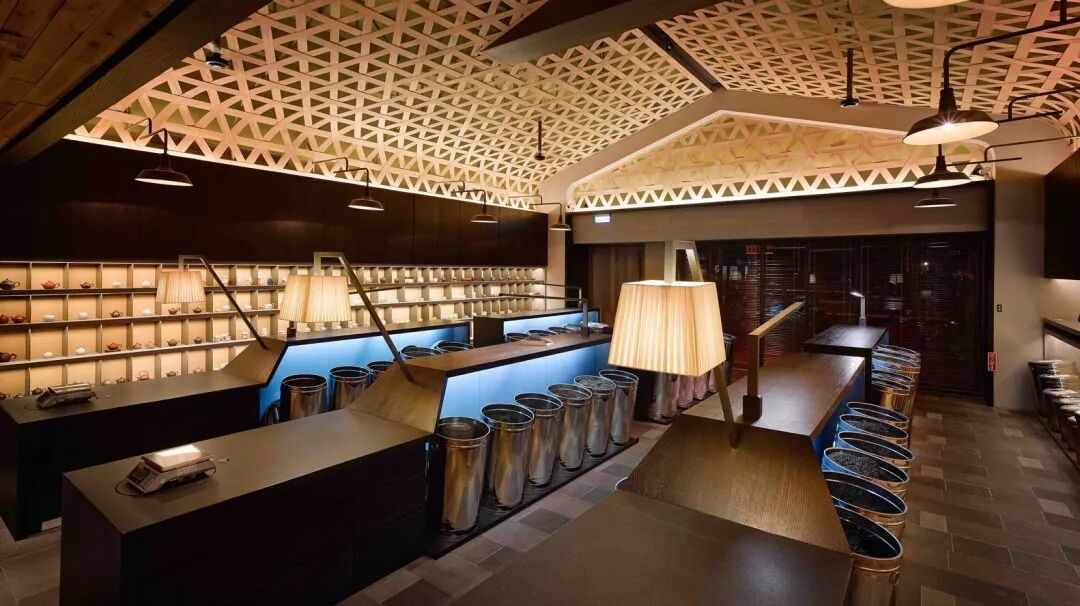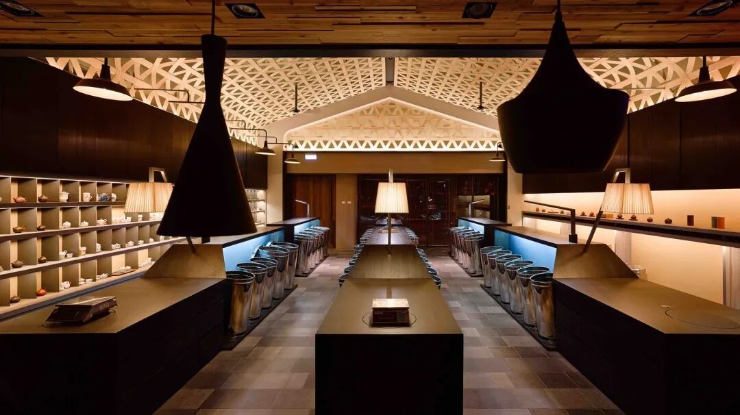源自传统茶道的灵感,建筑公司Ahead Design利用醒目的编织物点缀天花板,并配以深色木材和金属装饰,打造出古早味。