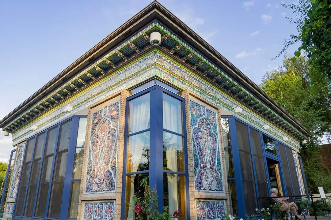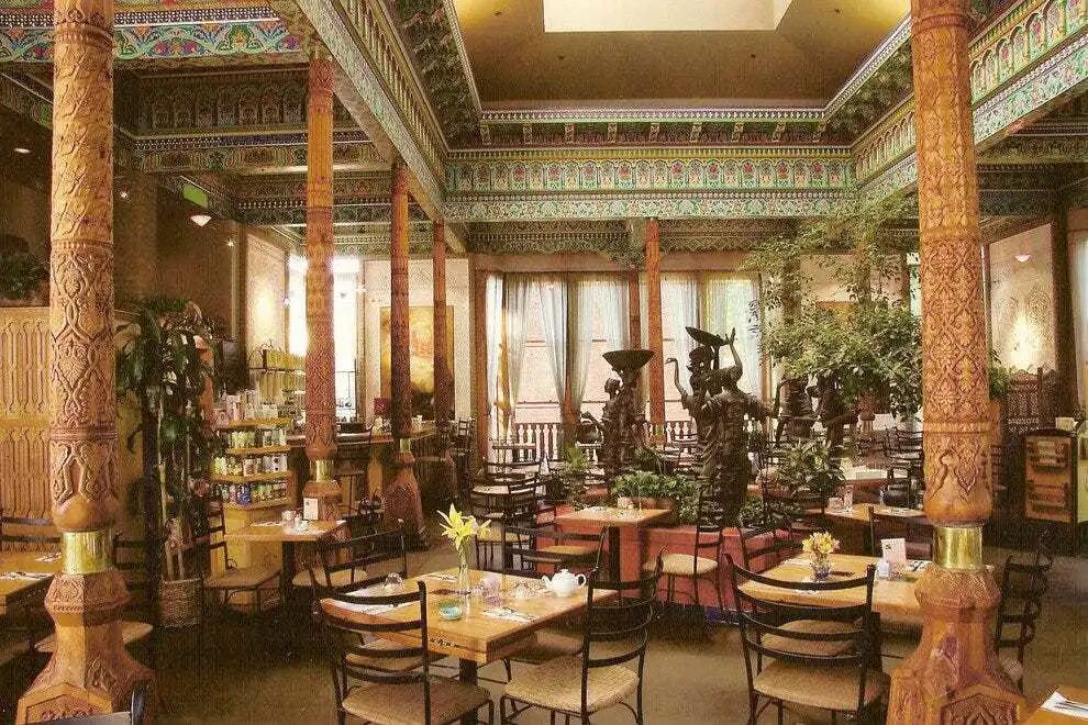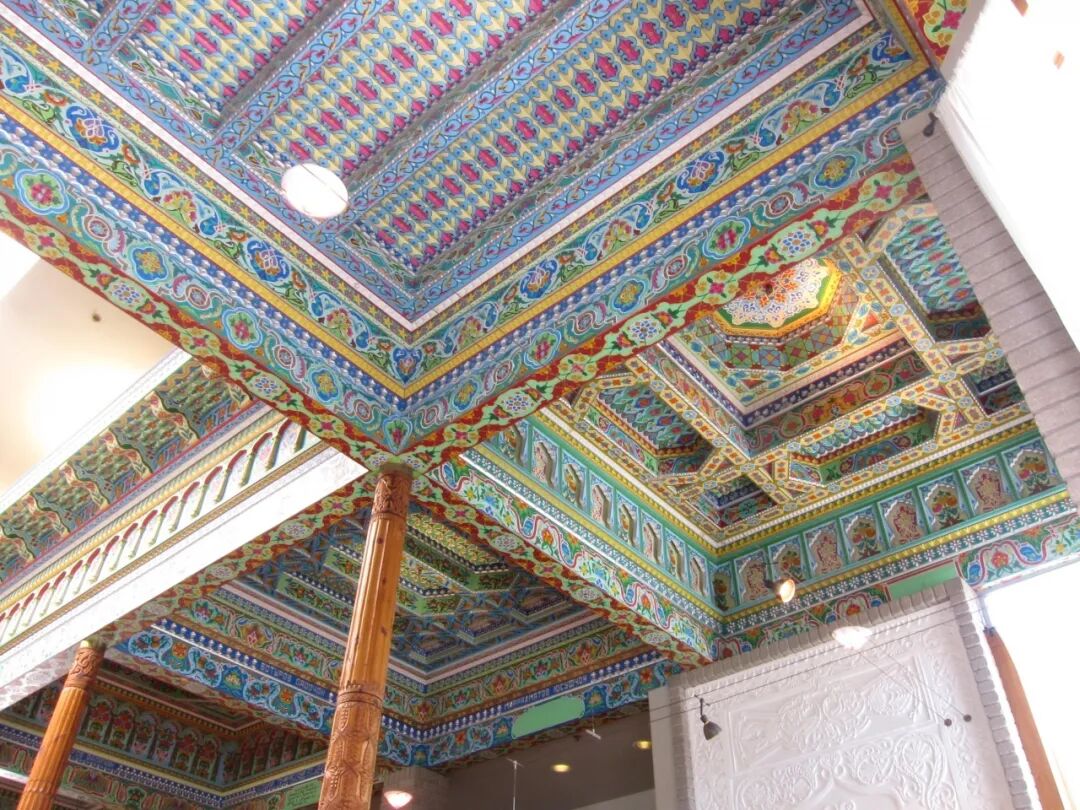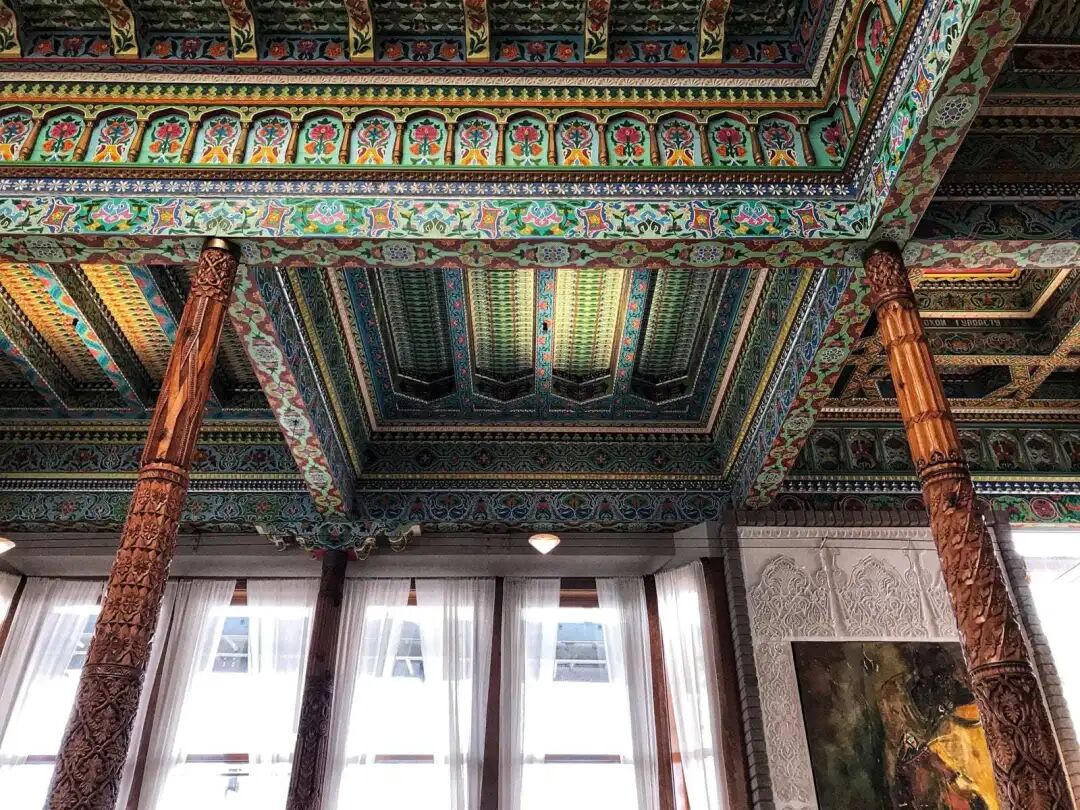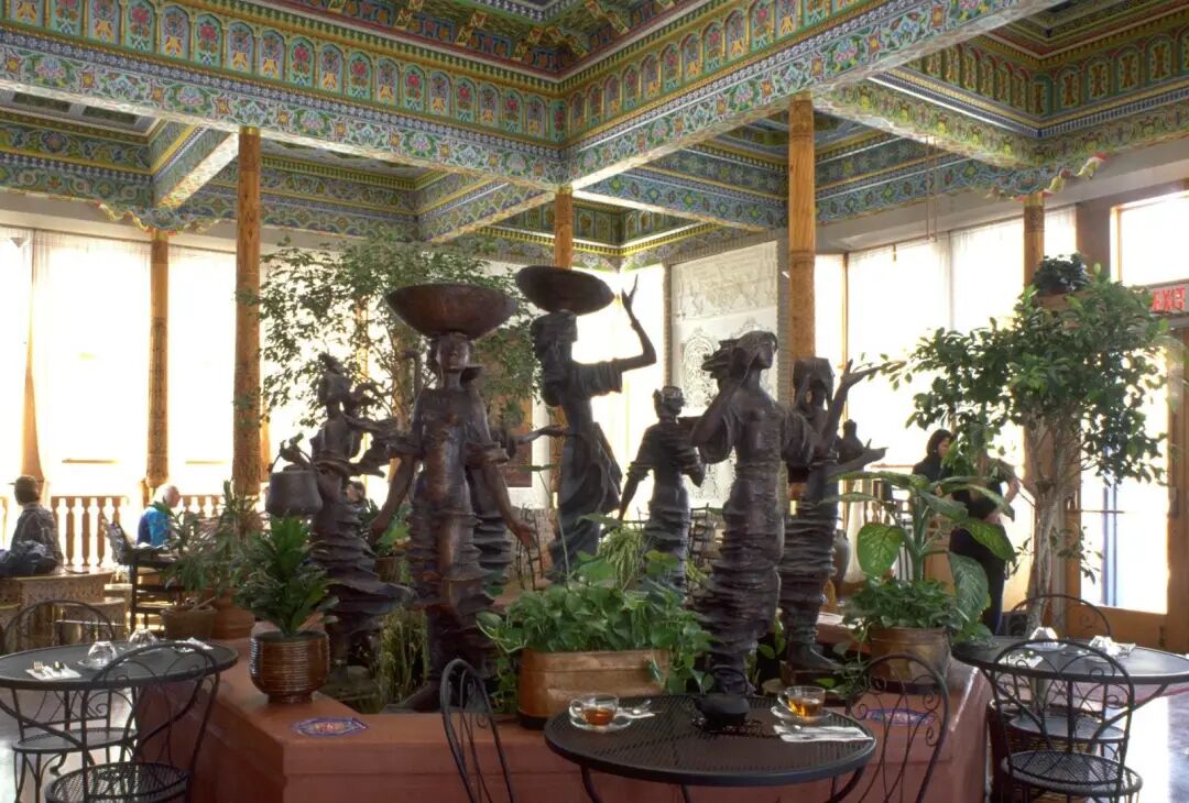 茶店极致华丽,雇佣了40位工匠进行完成天花板的雕塑和手绘、陶板墙面、石膏墙面以及7个不同的铜制雕塑。
