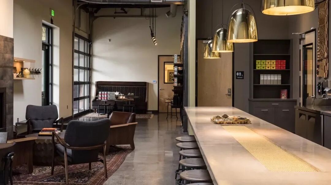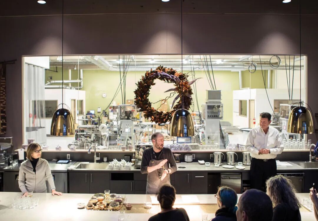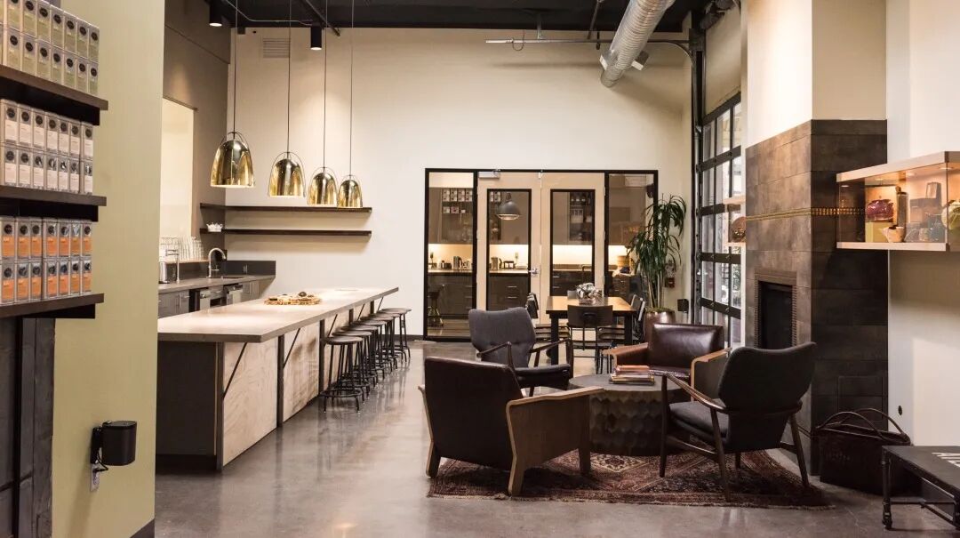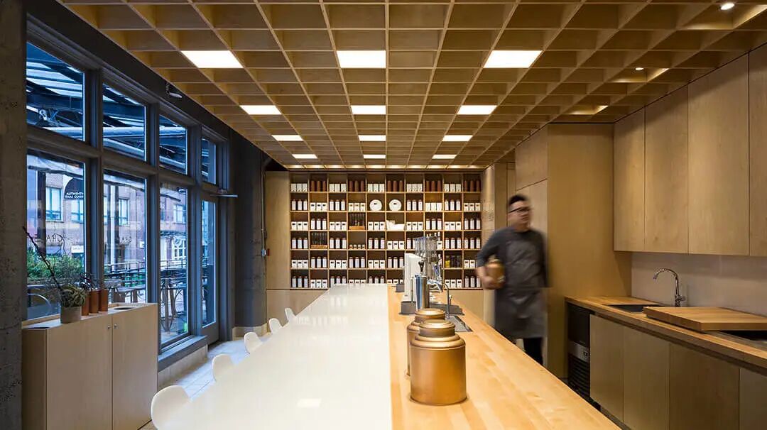 茶店夸张地占据了将近13,000平方英尺的空间,在顶天立地的落地大玻璃窗旁可以看到茶叶生产的全过程。