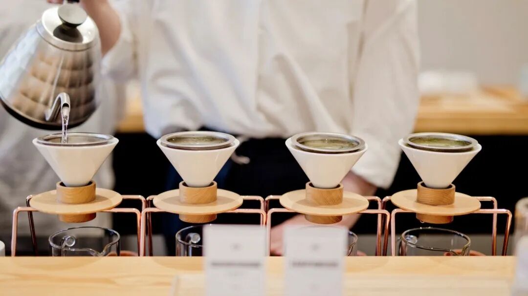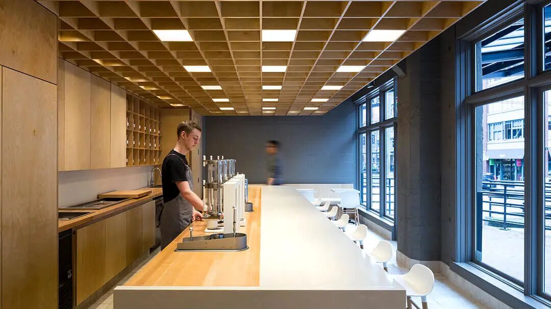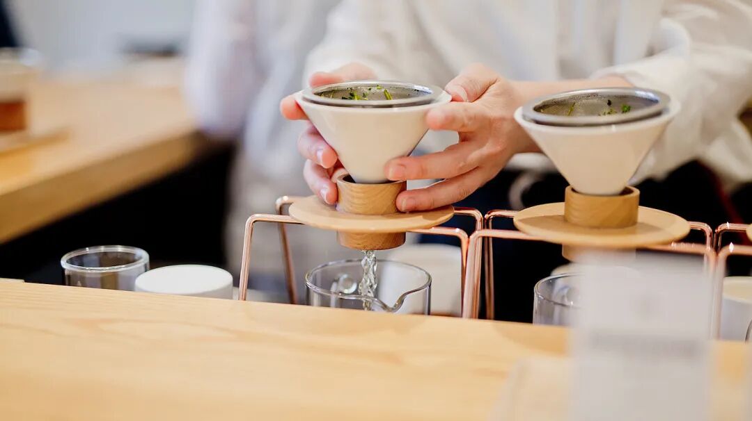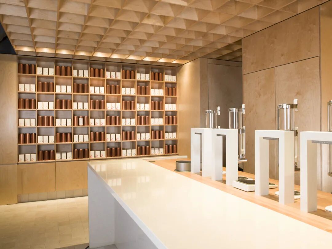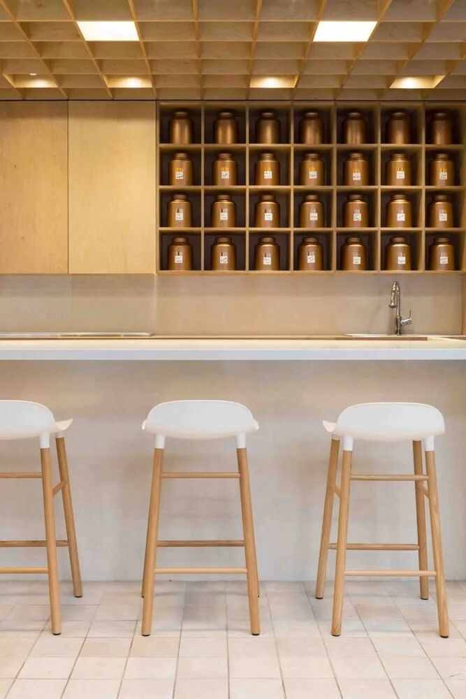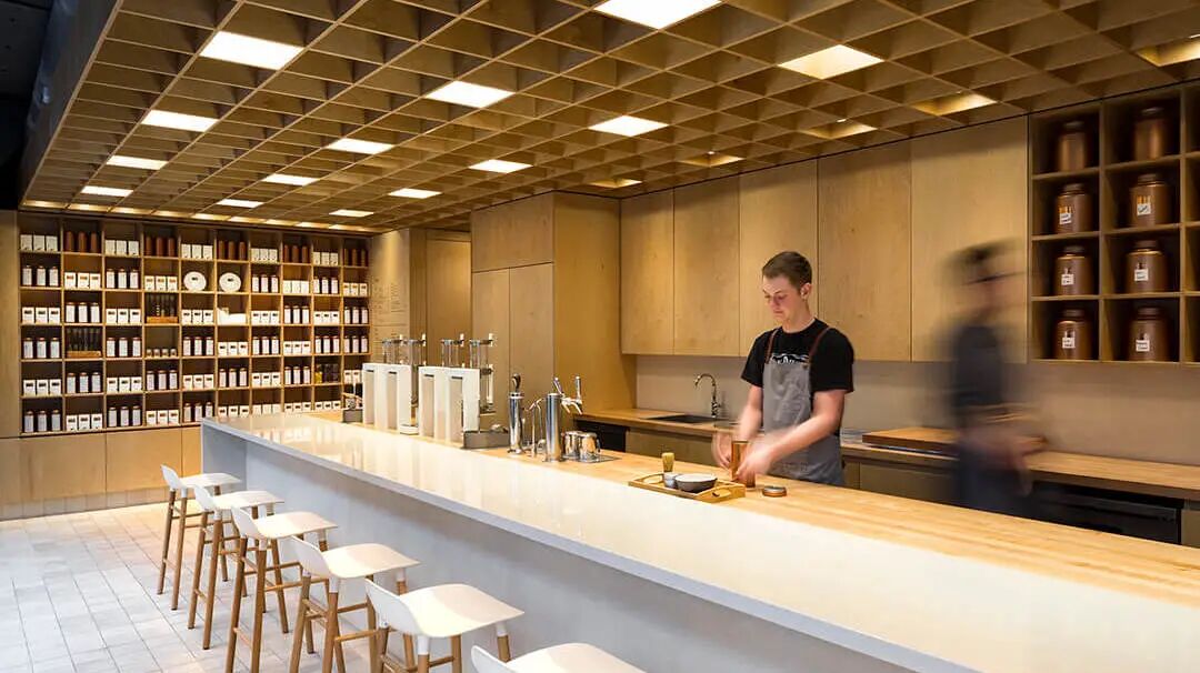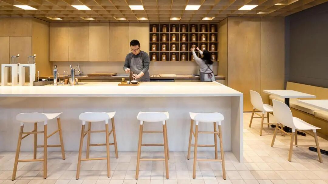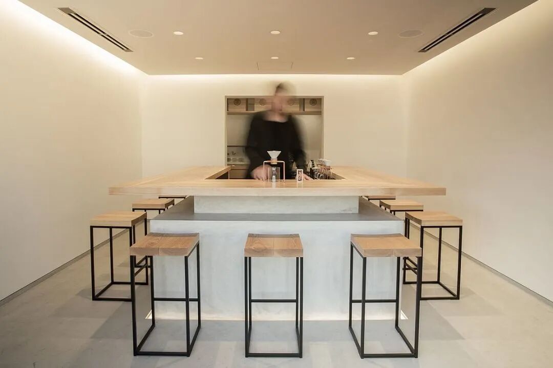 这是全球首家利用咖啡手冲法冲泡绿茶的专卖店,简约的室内设计如纯白墙面、天然木材家具是对传统日本茶室的重新诠释。