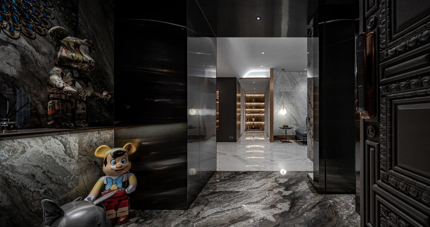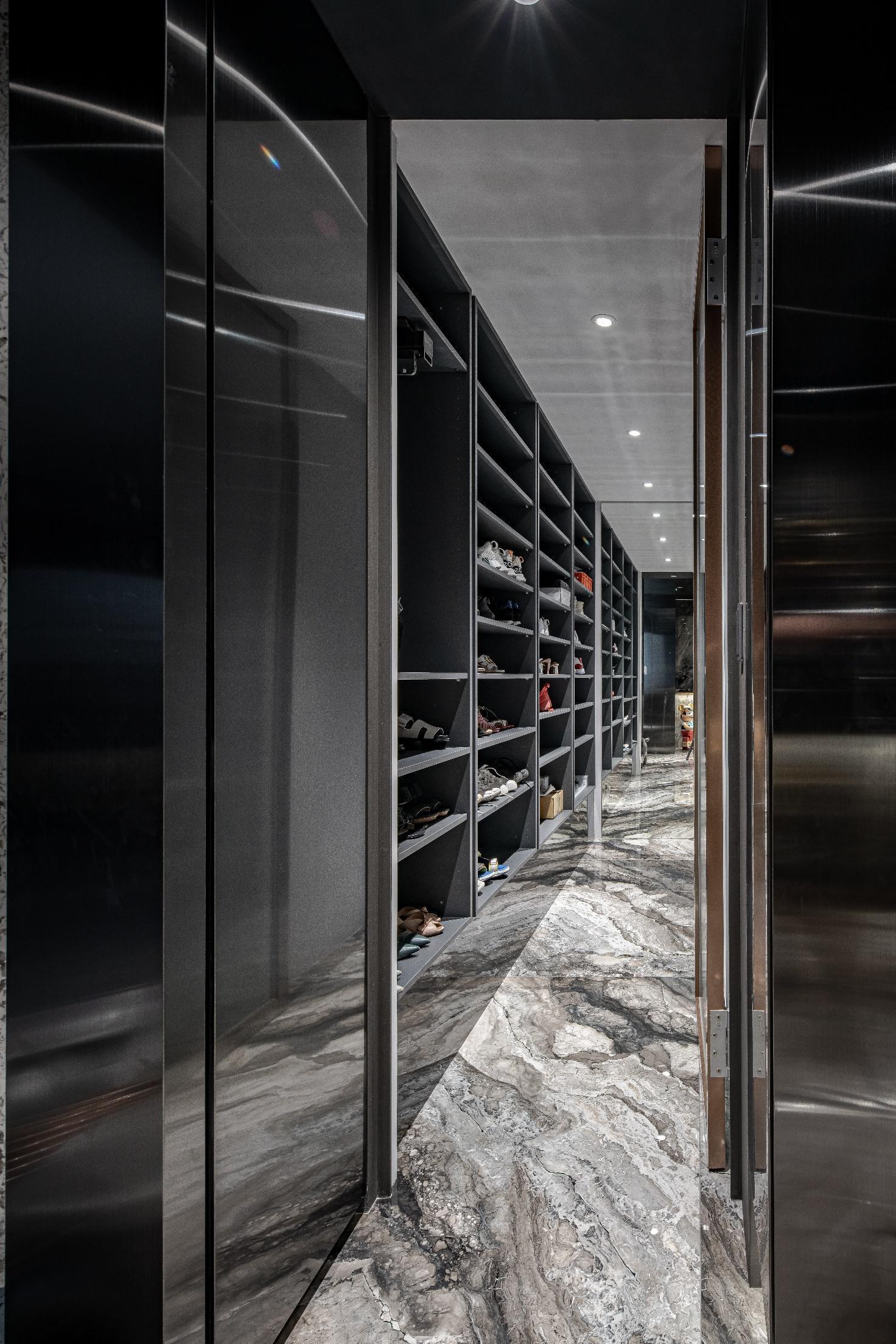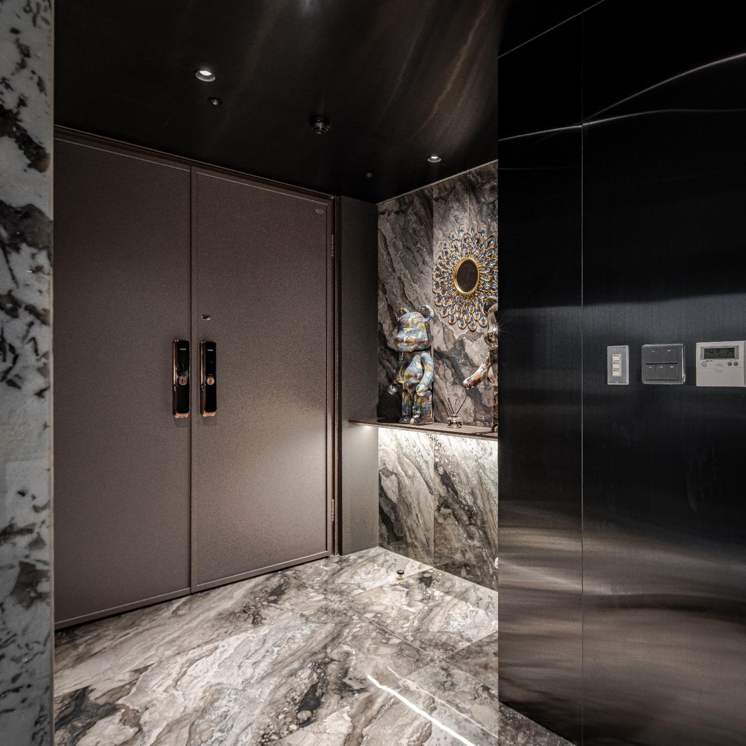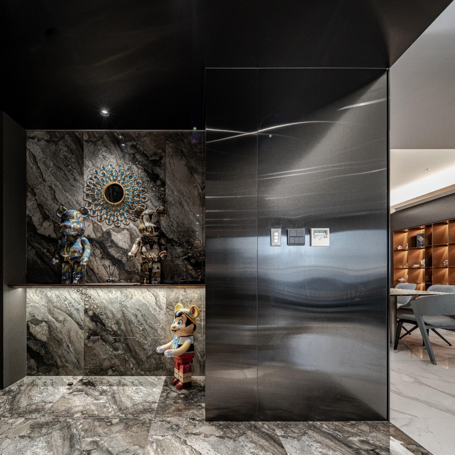 在材料的选择上,我们大量使用了金属和石材。在玄关处,地板和玄关壁面使用了大尺寸的灰黑色系纹路砖。柜体部分使用了黑色镀钛金属,并包覆了柱体。天花板也采用相同的方式,但在玄关柜层板和鞋柜区门框上,我们添加了古铜色,以增添高贵质感。
