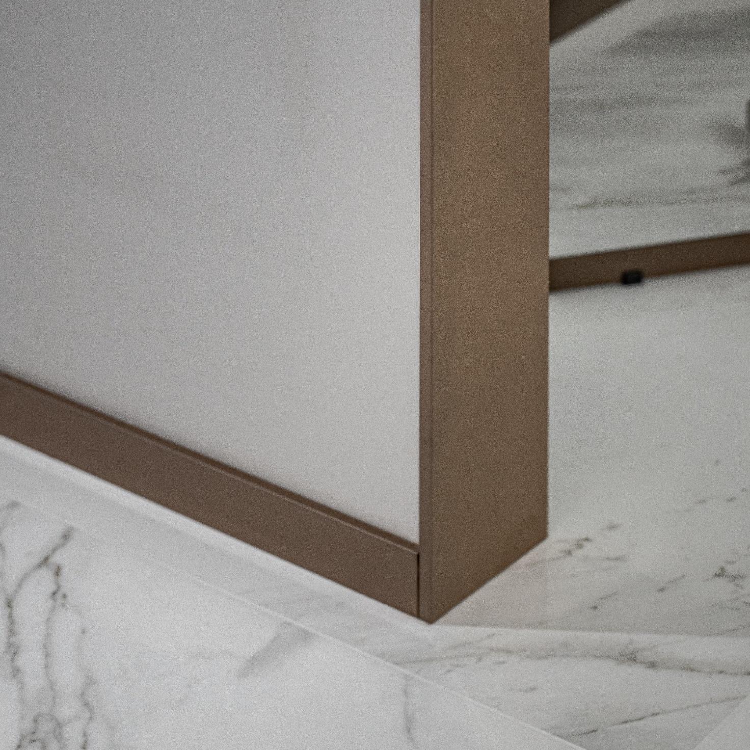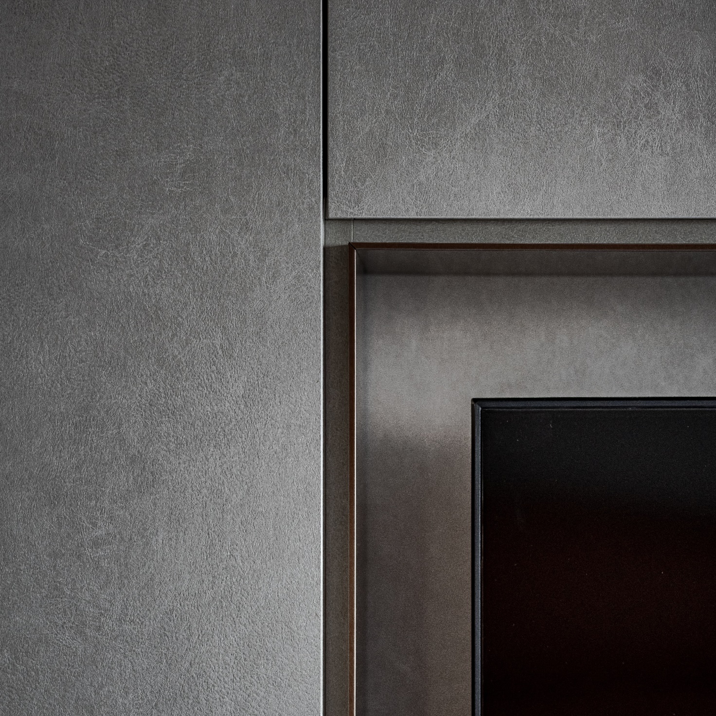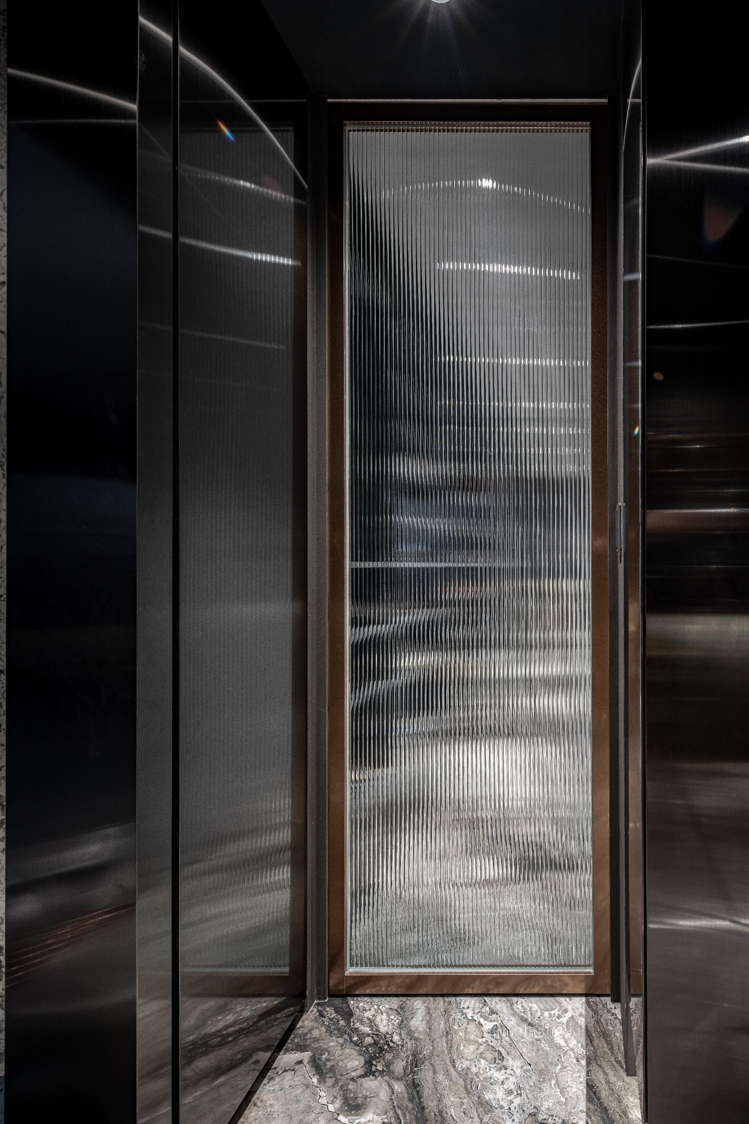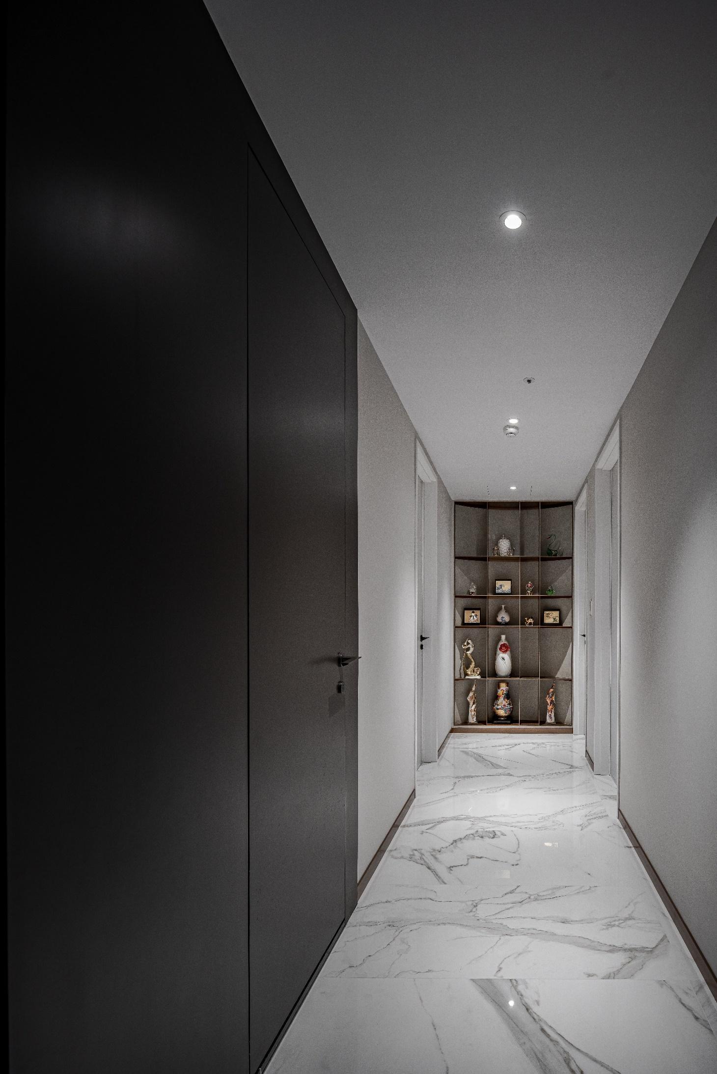 在材料的选择上,我们大量使用了金属和石材。在玄关处,地板和玄关壁面使用了大尺寸的灰黑色系纹路砖。柜体部分使用了黑色镀钛金属,并包覆了柱体。天花板也采用相同的方式,但在玄关柜层板和鞋柜区门框上,我们添加了古铜色,以增添高贵质感。