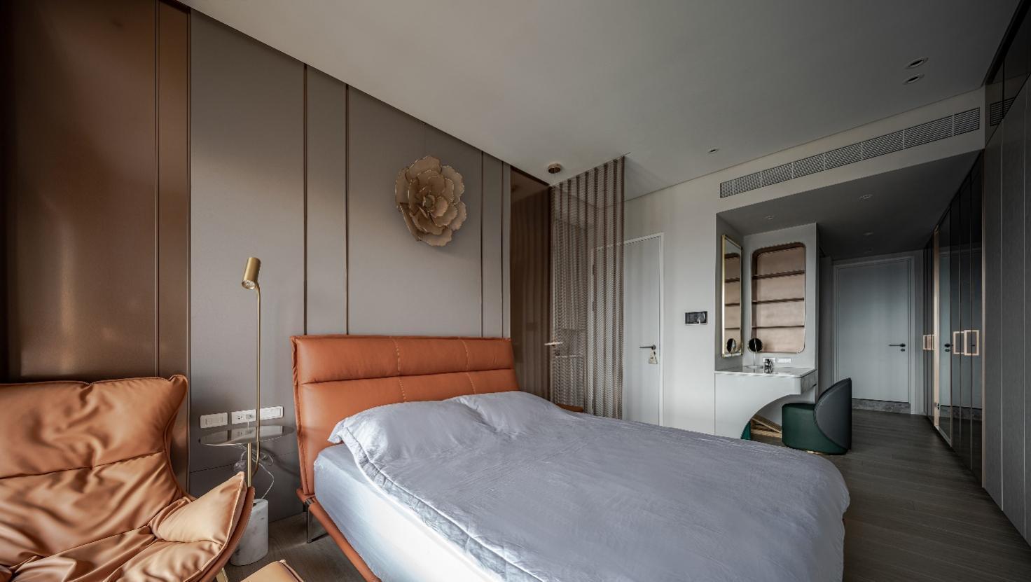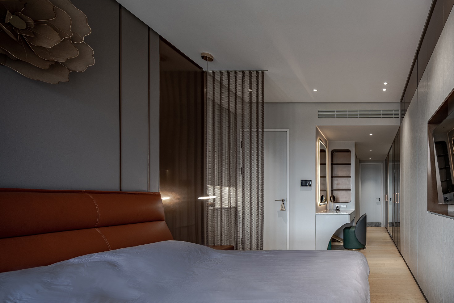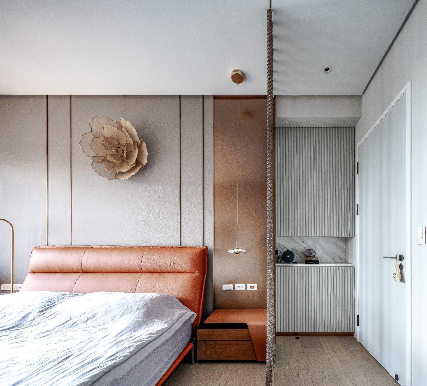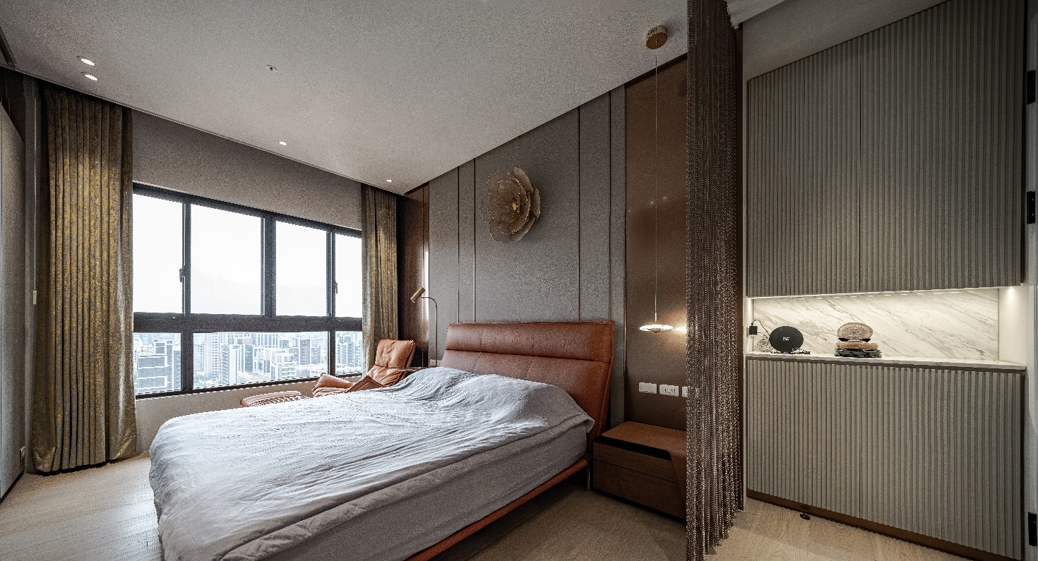 主卧室的设计注重不同区域的精细规划,旨在打造沉稳且优雅的氛围。一进入主卧室,右侧规划了一个收纳柜体,通过金属帘区隔出睡眠区。