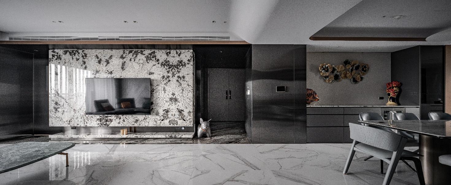 移步至客厅处,往玄关方向看,可以发现巧妙的设计。我们运用金属天花板和灰黑色地砖创造出一个框架,视觉上区分了玄关和客厅区域。同时,使用古铜色金属作为框架缀边,客厅的大电视墙以简约俐落的线条展现,使石材看起来更轻盈。