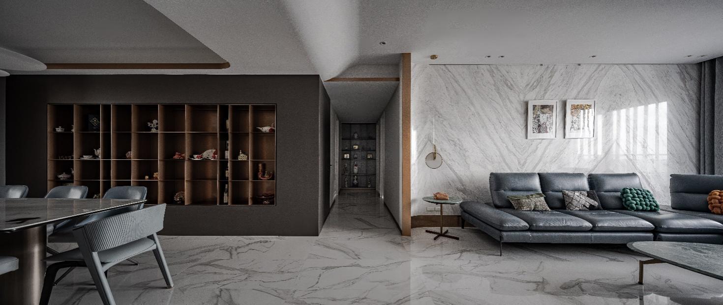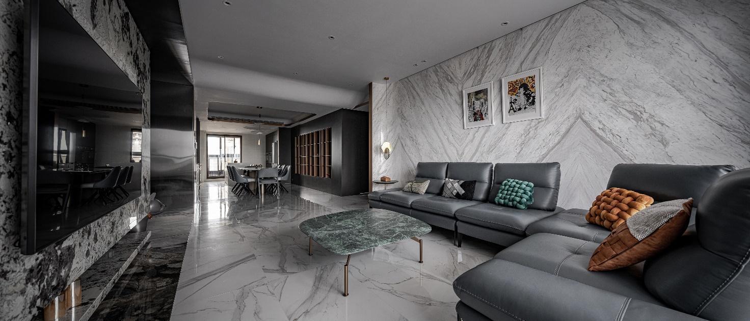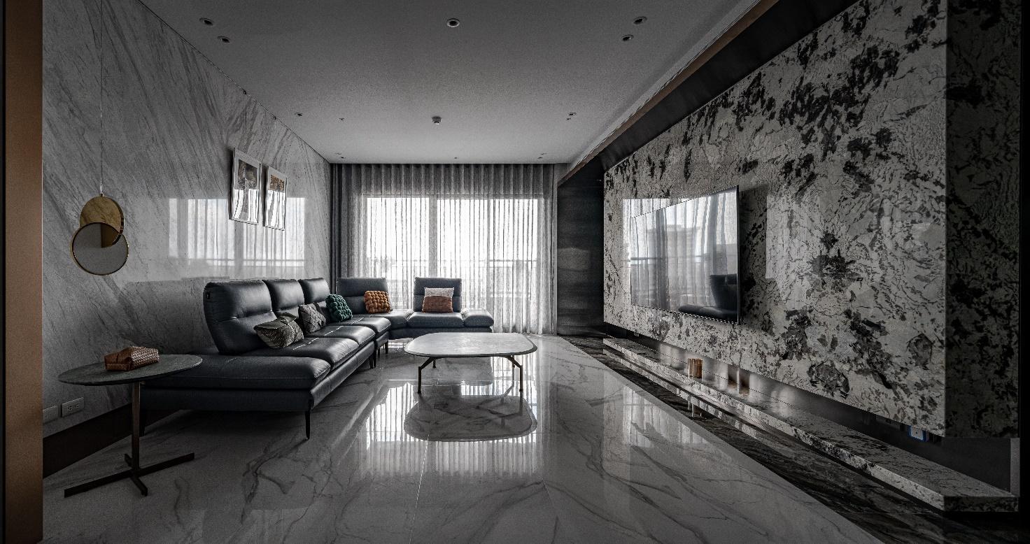 沙发背墙使用白色系银狐石材,并在靠近走道处做了圆弧施工,使用古铜金属作为缀边及踢脚板,增添了细致感。