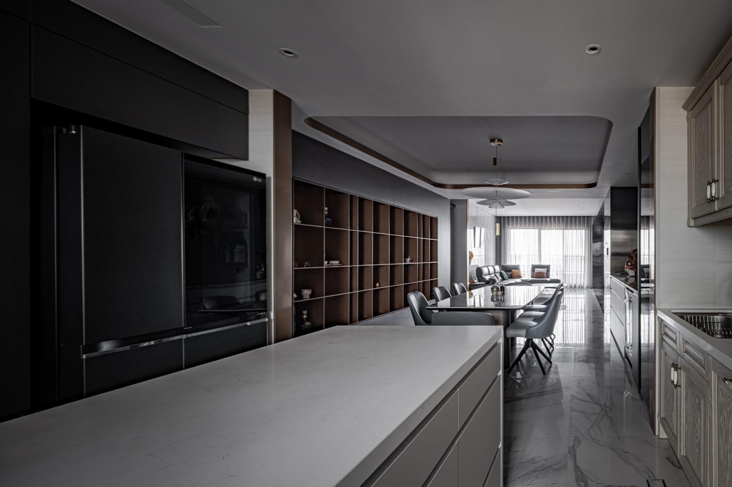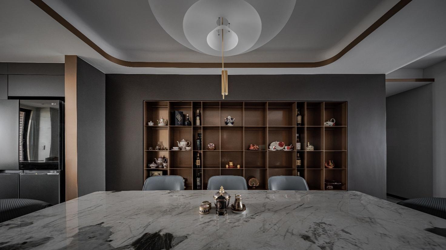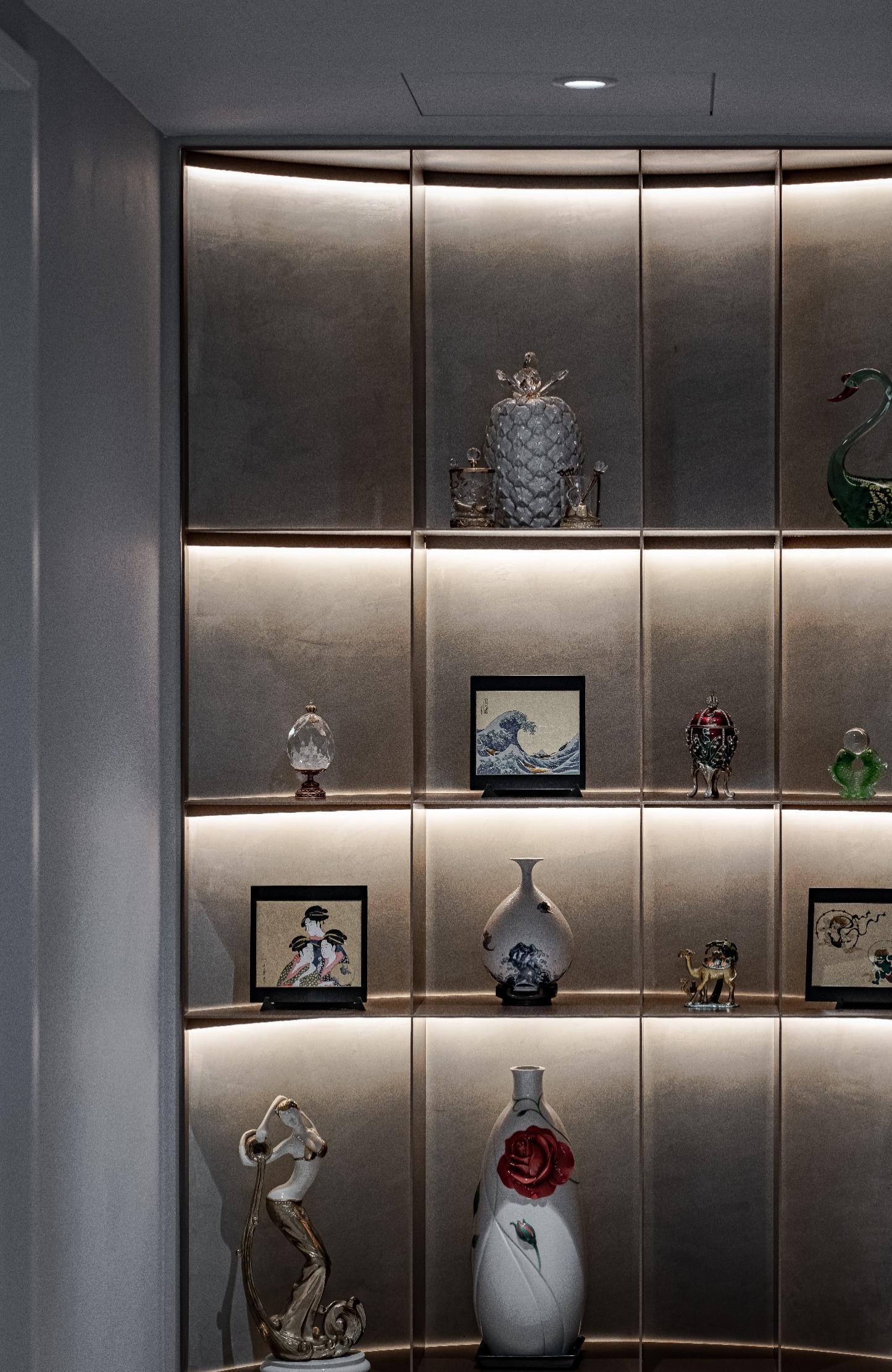 在餐厅右侧,我们设计了一个金属展示柜,成为这个空间的主轴,让屋主可以展示旅行带回来的纪念品。另一侧则是一个餐柜,内含红酒柜及高柜,不仅美观而且实用。