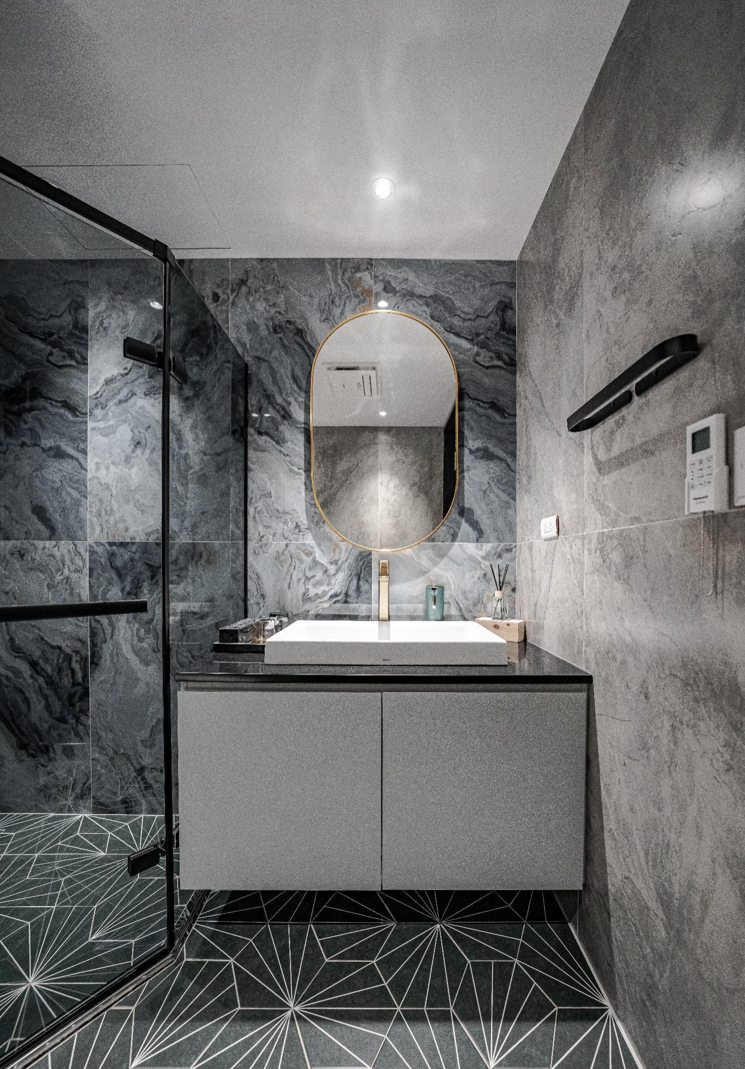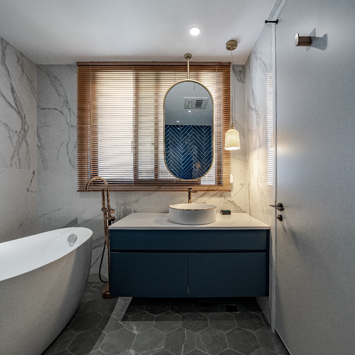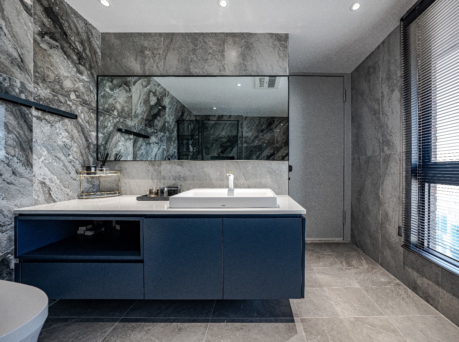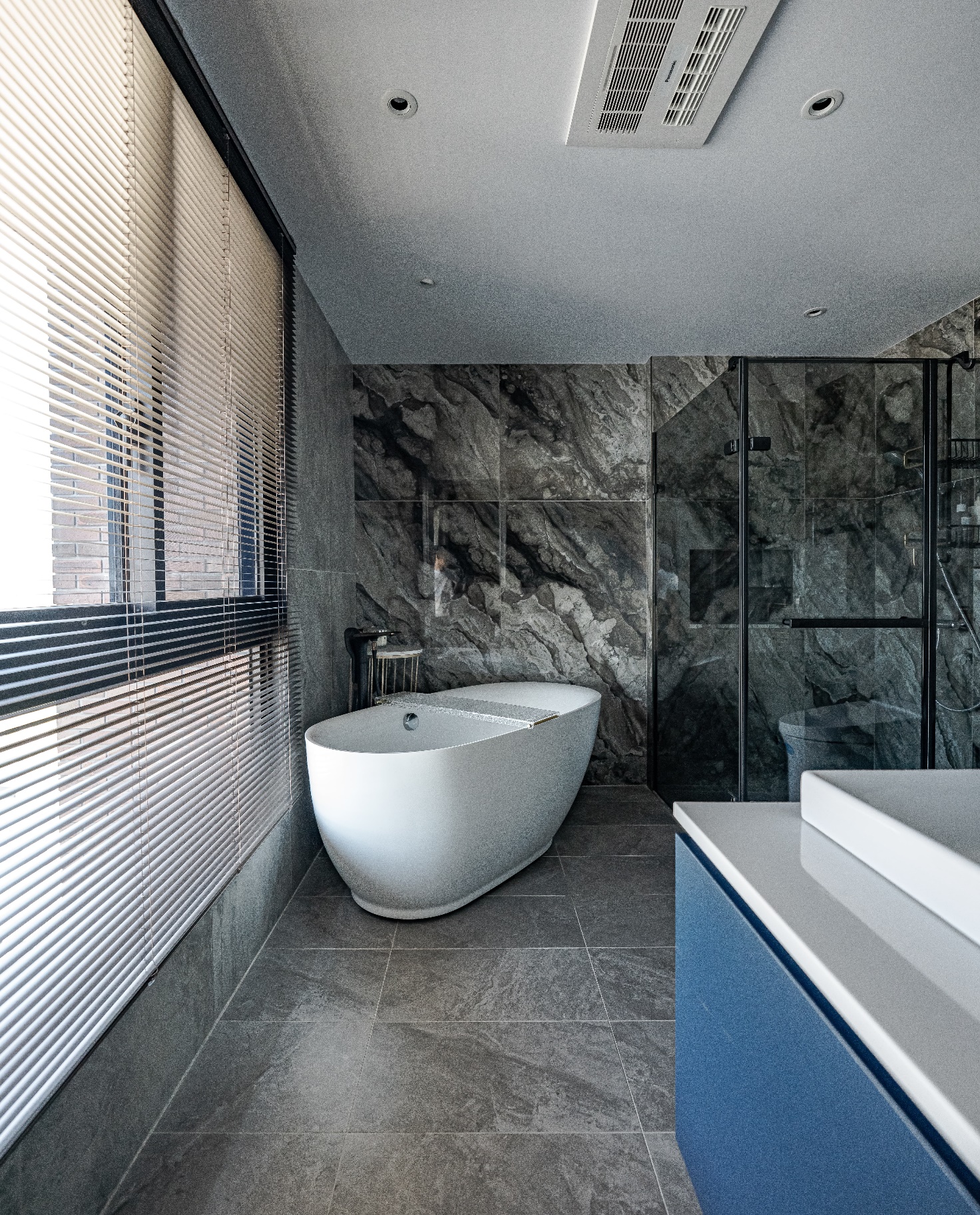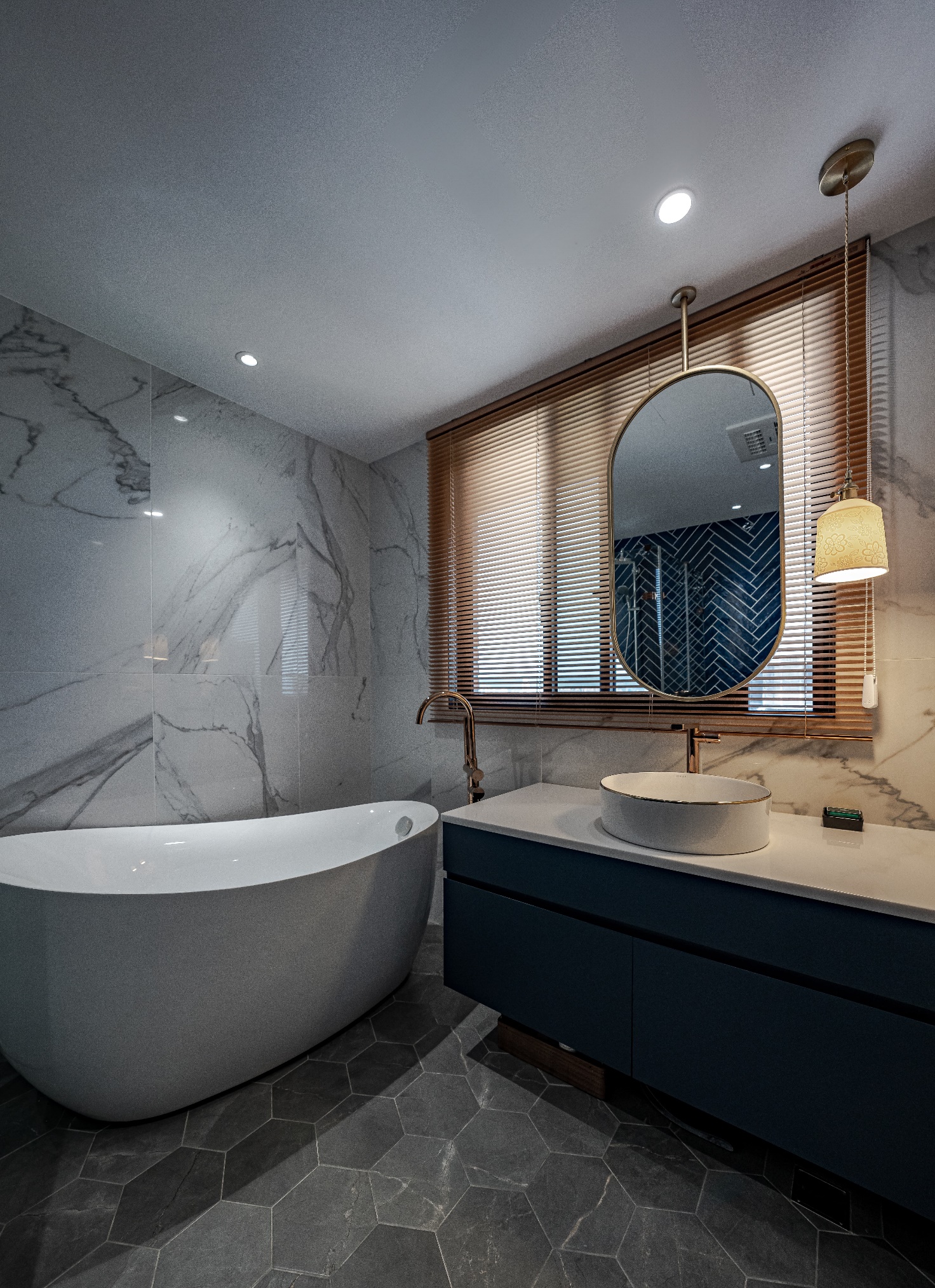主卧室的卫浴区主要采用白色灰纹瓷砖,搭配长型宝蓝色磁砖。地砖方面选择了灰色石纹六角砖,卫浴配件搭配玫瑰金五金,包括浴缸龙头、面盆龙头,甚至金属百叶的部分也选择了相同的色调。浴柜的颜色同样呼应了宝蓝色的长型壁砖,使整体氛围呈现高雅尊贵的感觉。