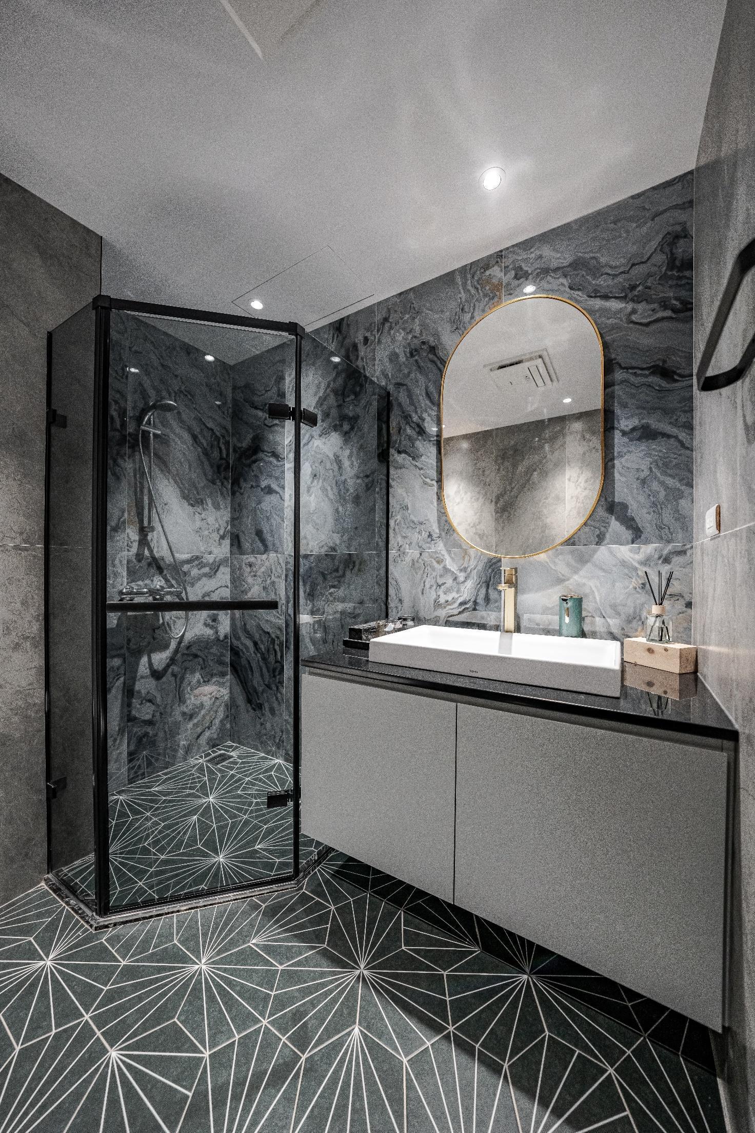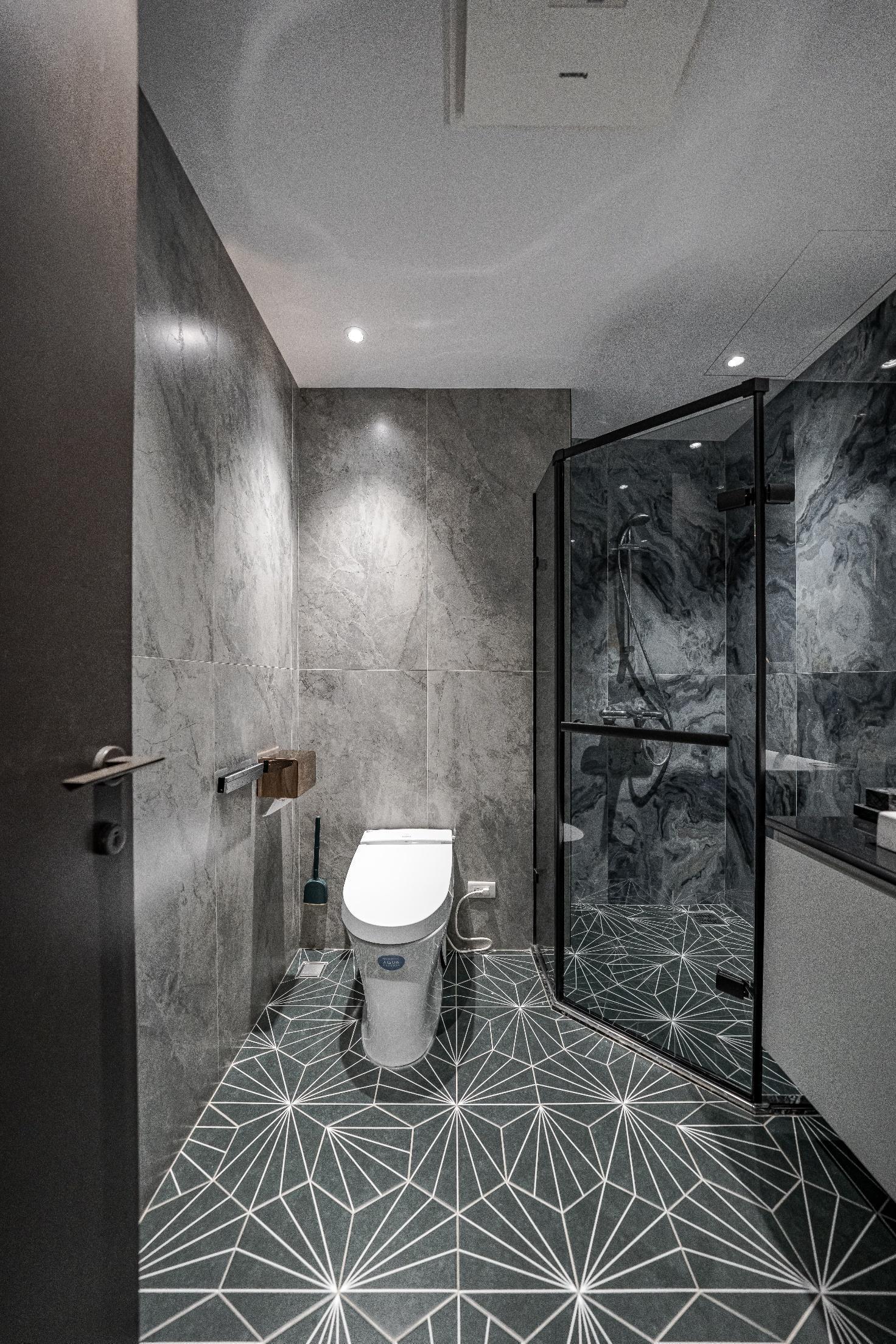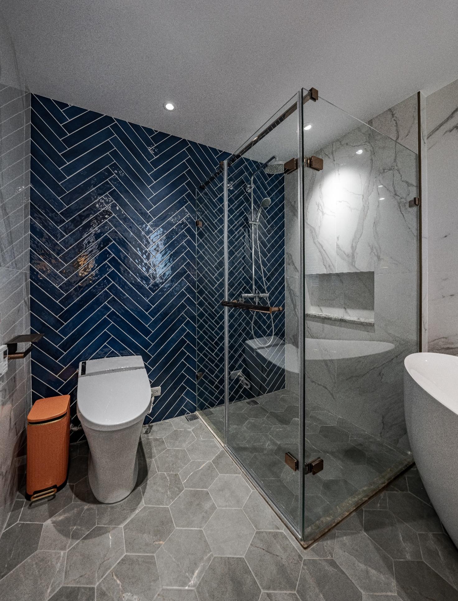 客用卫浴的墙面选用蓝色磁砖搭配灰色磁砖,地板使用六边花纹砖拼贴,并搭配黑色淋浴玻璃,充分展现时尚感。