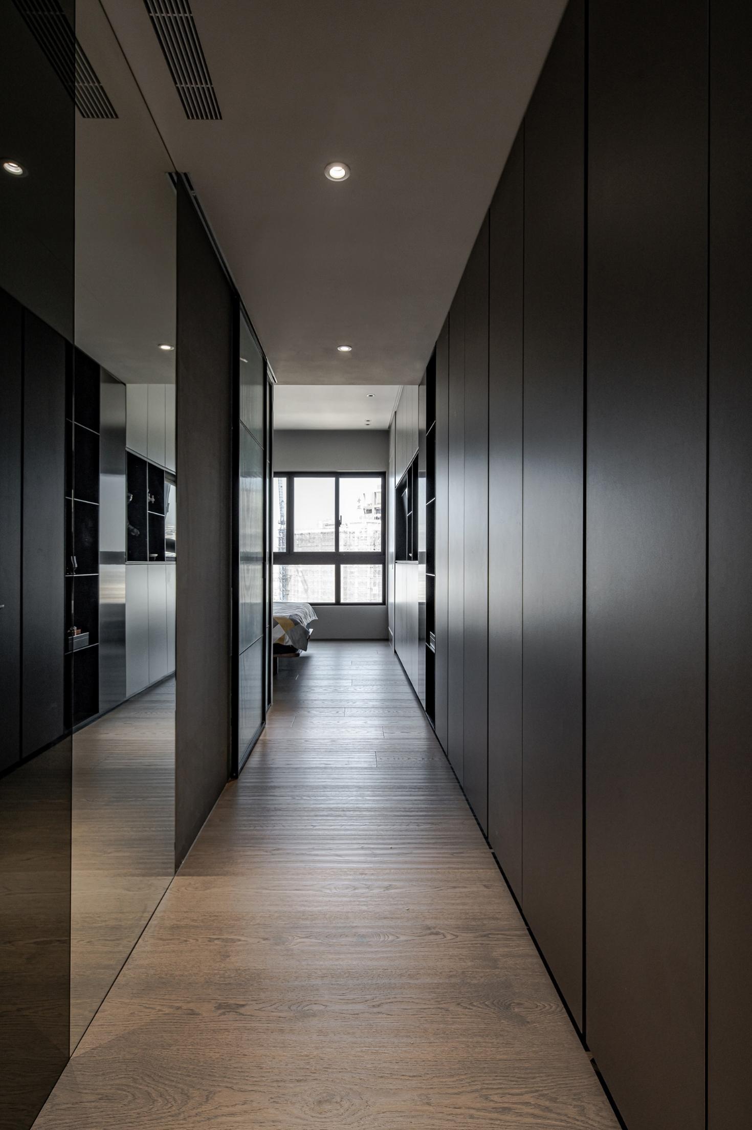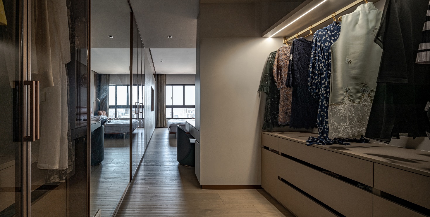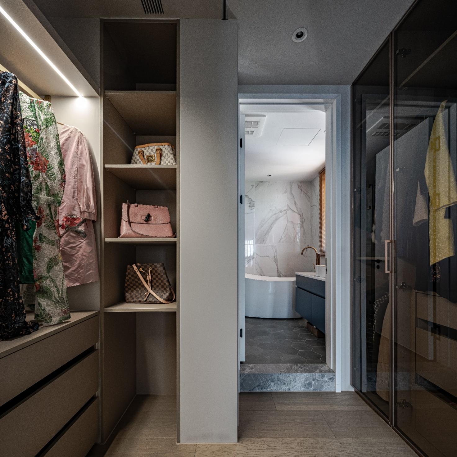 柜体一路延伸至更衣室,门片材料转换为古铜金属搭配玻璃,不仅考虑机能性的不同,也提升了整体质感。