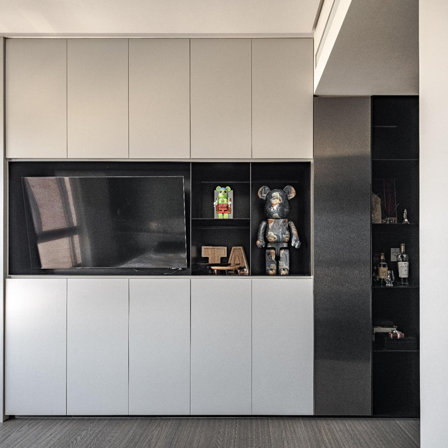 电视墙和柜体选用灰色布纹门片搭配古铜色金属,与床头设计相呼应。