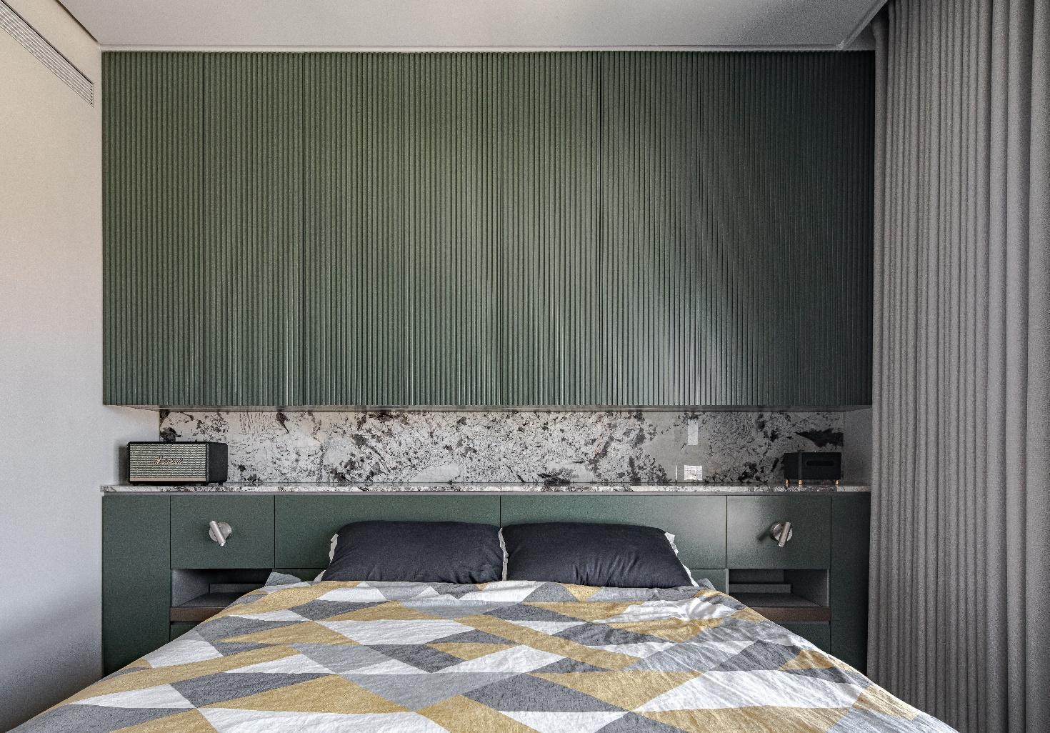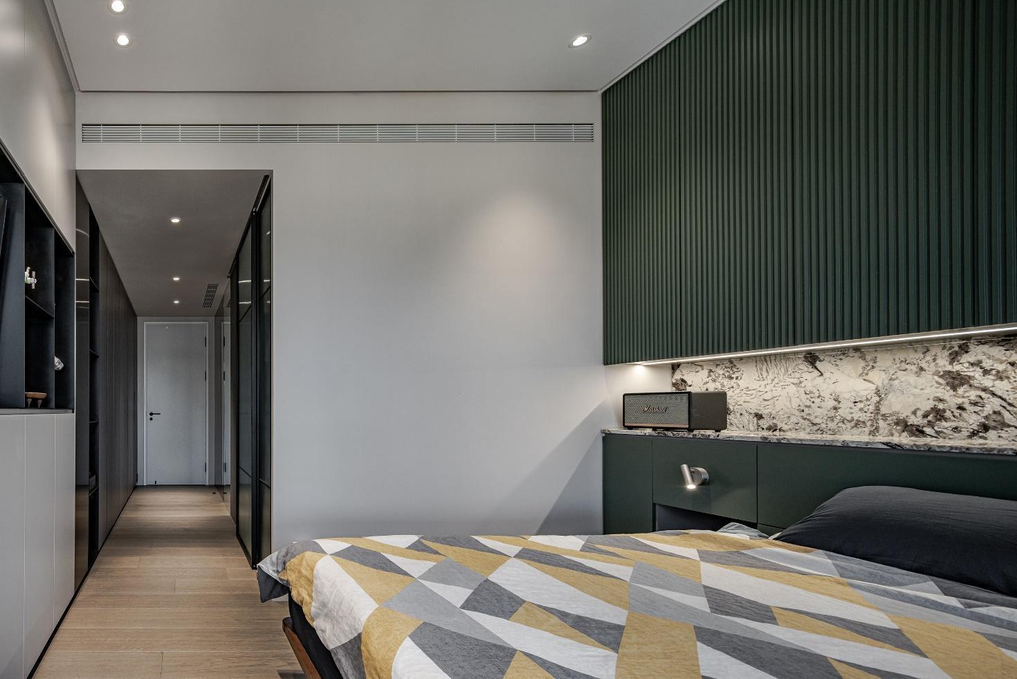 睡眠区床头设计了上下柜,以高雅的绿色搭配石材台面,床头两侧还设计了床头抽屉,地面则使用大尺寸手刮纹木地板,舒适且大器。