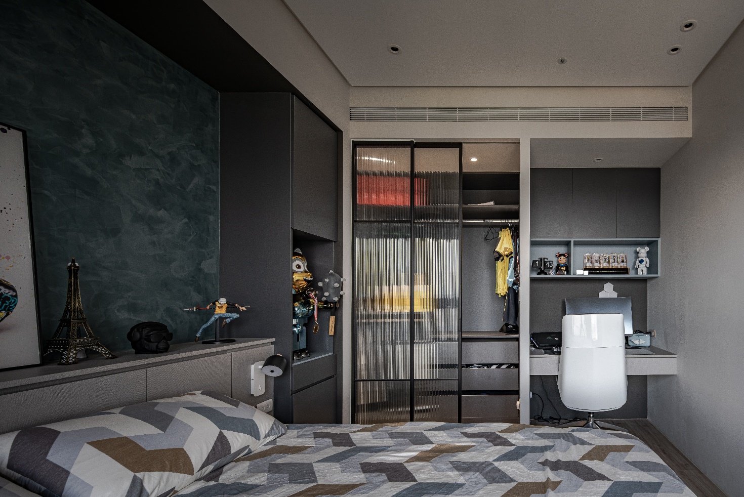 至于小孩房1,我们采用了灰黑色柜体搭配蓝色墙面,展现独特的个性。