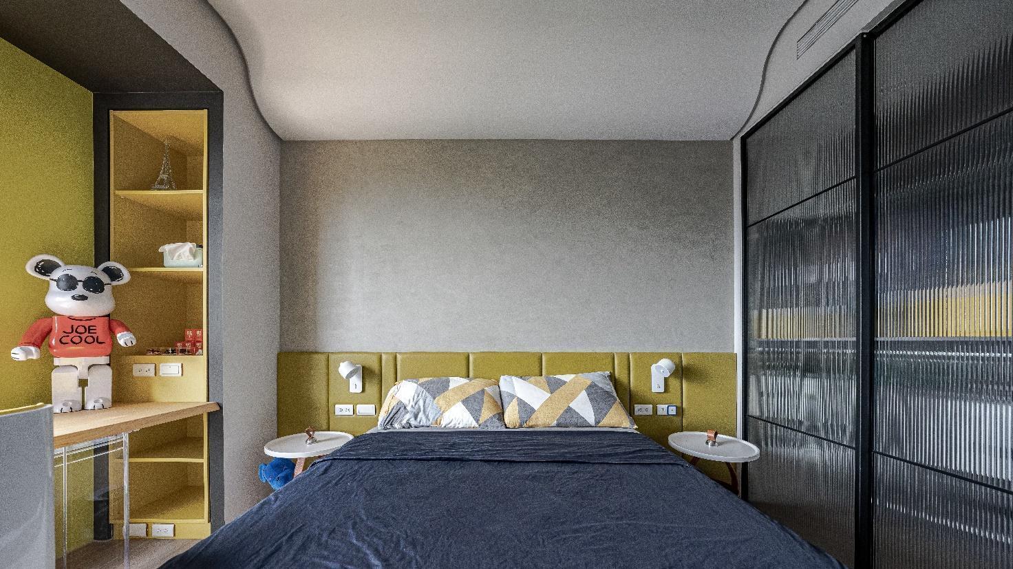 而小孩房2则使用了灰色搭配芥末黄的床头,局部还有鲜黄色的书柜。书桌方面选用了实木桌板,使整体空间充满了活泼感。两间小孩房均设计了更衣室,同时兼顾了实用性。