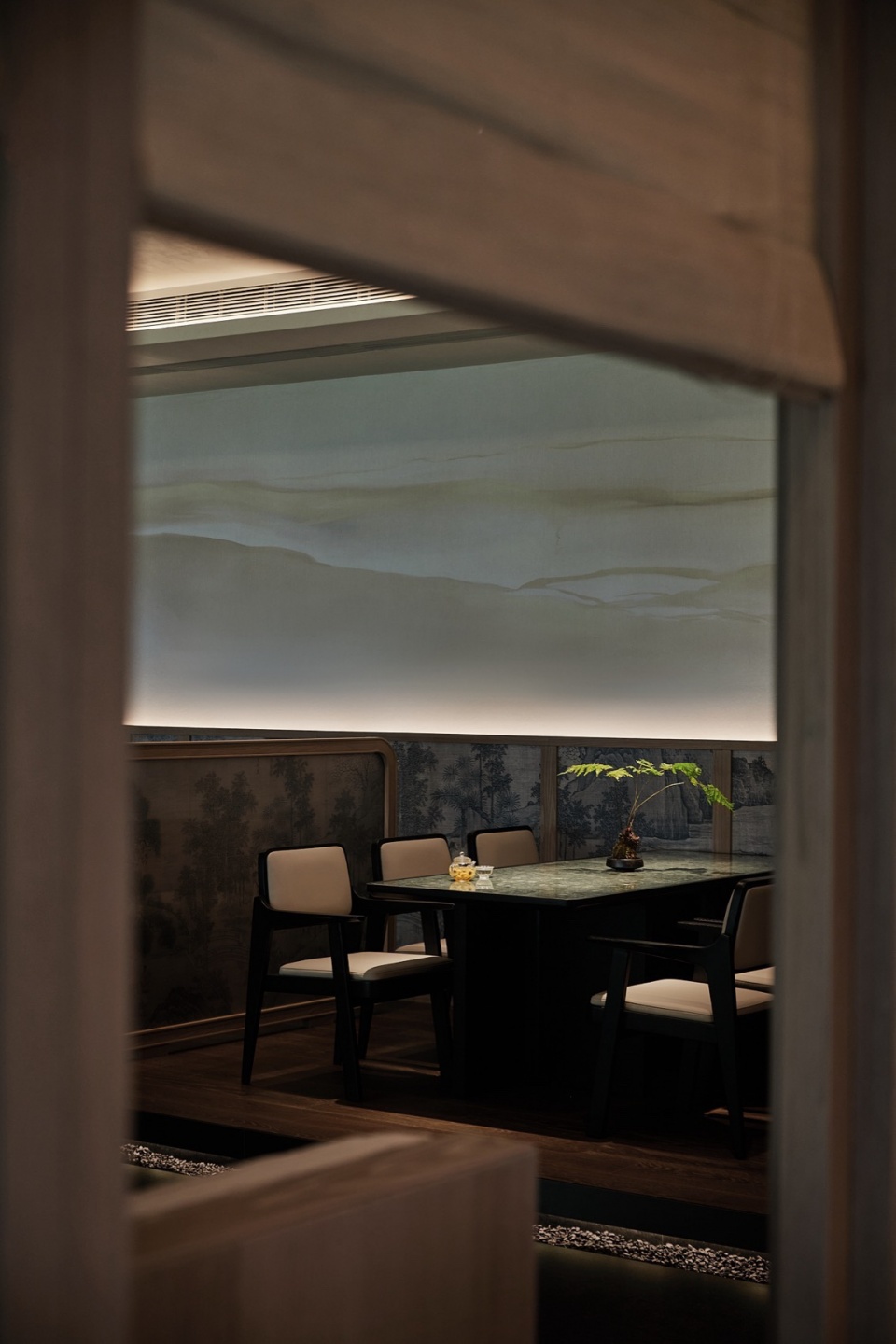 抬高处理的茶台,以几何体块构筑空间序列。雪松木皮肌理如山水皴笔,在触手可及的肌理间,纳入自然的呼吸感。