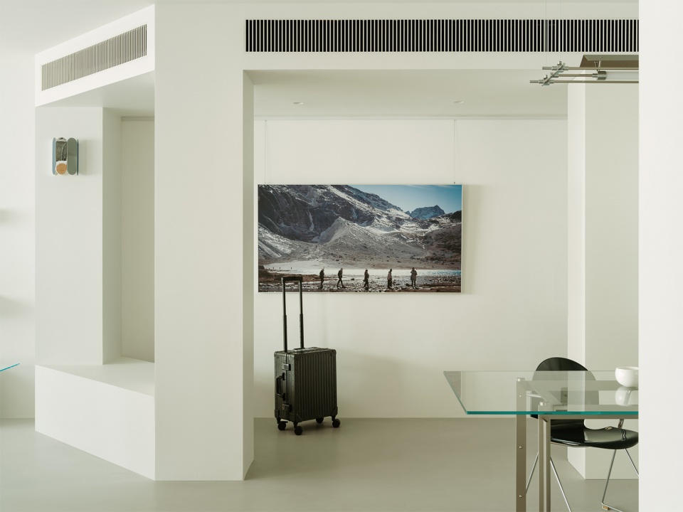 入户区通过吊顶的变化形成过渡,设定了从外部进入起居的节奏。并整合空调造型、储物柜收纳与分隔功能,加强空间的体块感受。