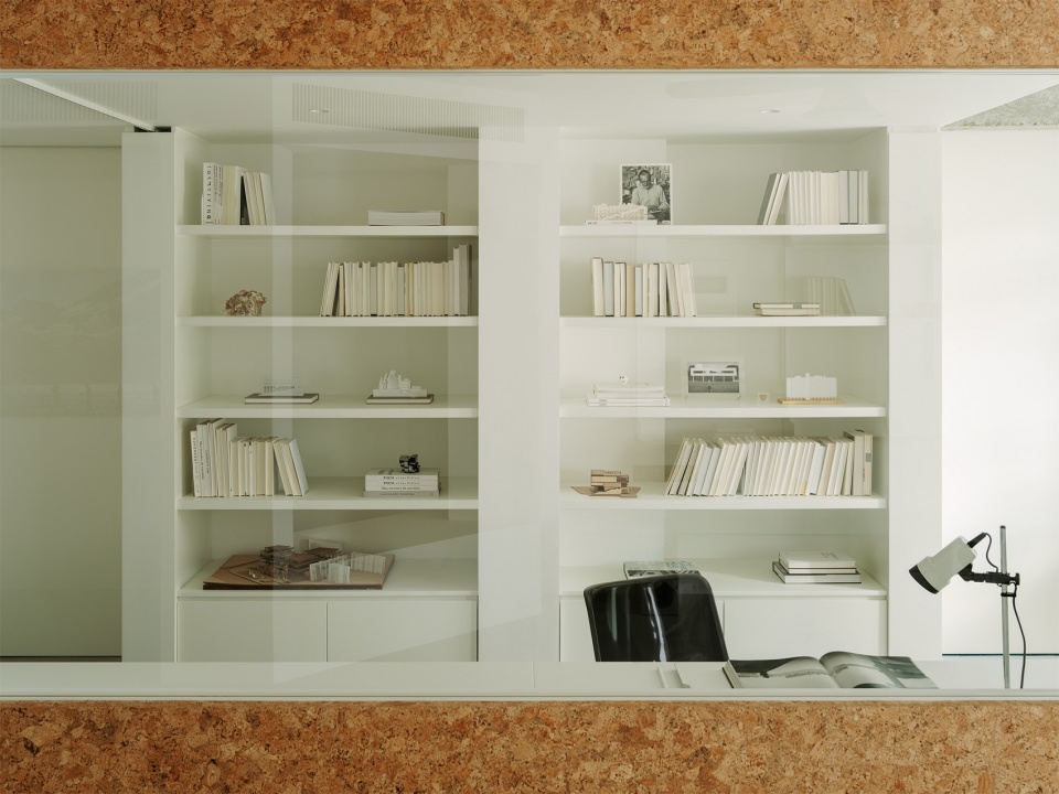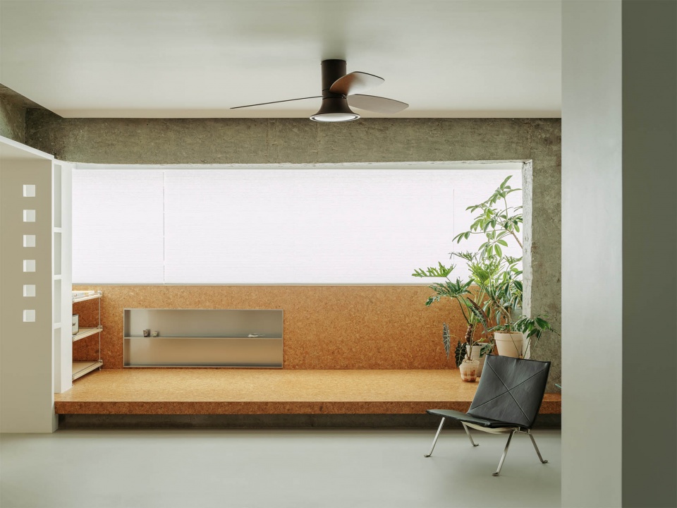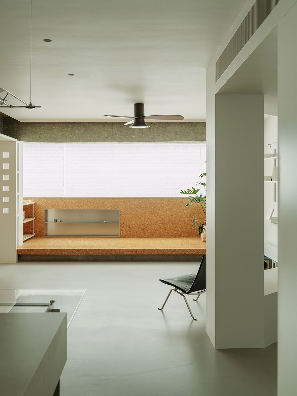 The study is positioned at the edge of the active zone, connected to the living room through a slim-framed interior window and a sliding door. Its semi-open interface allows seamless switching between focused work and social interaction, while maintaining the flow of light and sightlines. Caramel-colored cork panels create a warm and soft atmosphere, and the space features a seamless finish without baseboards, achieving a continuous and unified appearance.