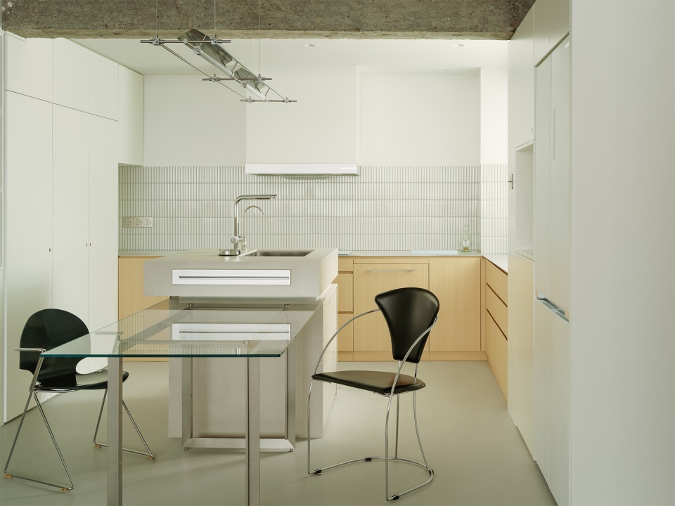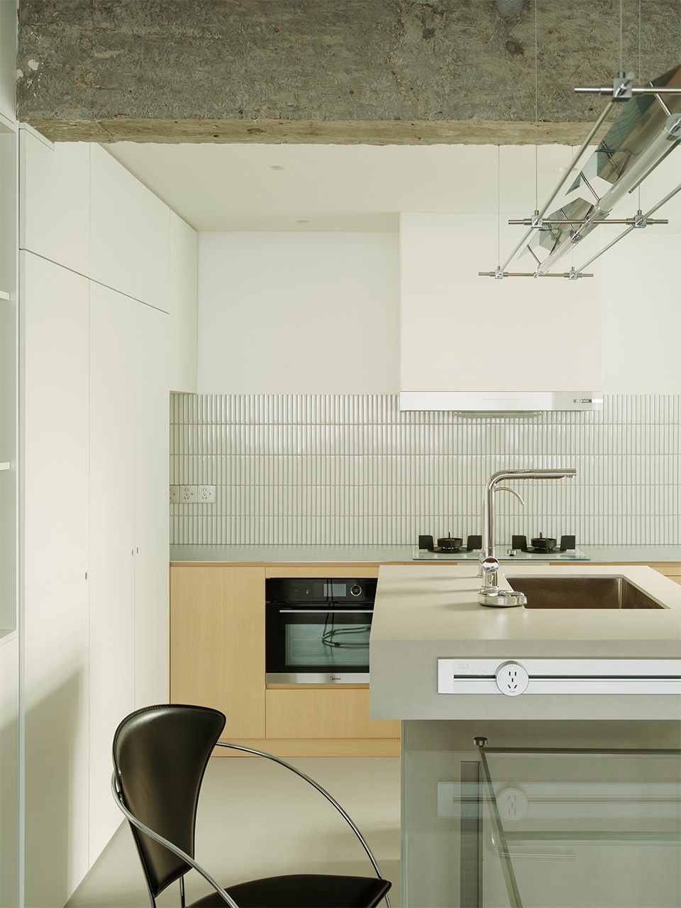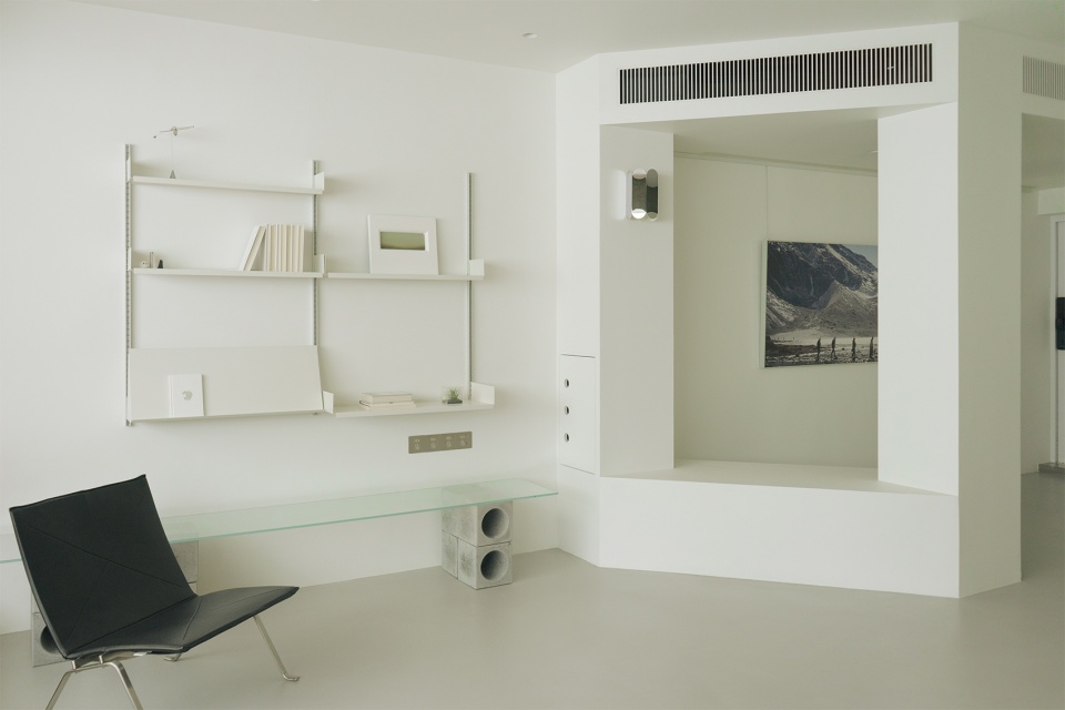 厨房、餐厅与客厅被布置在同一侧,成为交流与共享的区域。整体以灰色和木色为基底,弱化装饰,突出空间序列感。客厅取消传统大型沙发,采用低矮地台与单椅设计,释放中央场域,增强空间灵活性与多功能性。