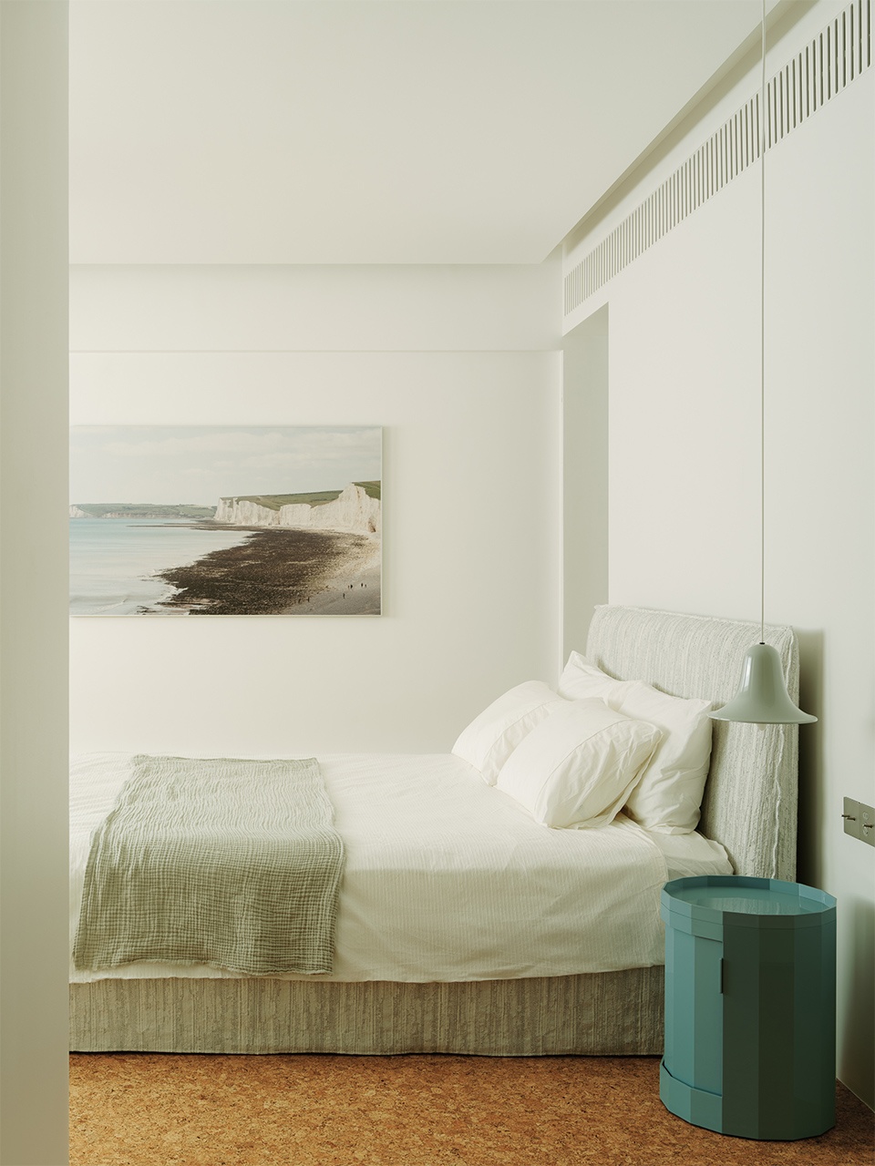 主卧采用双动线布局,衣帽间与两组卫浴的并置与连接,使居住者在早晚高峰时段可顺畅完成起居动作,减少等待与绕行。软木的天然纹理和低反射表面,弱化光线的锐利感,让卧室呈现更柔和的明度和氛围。