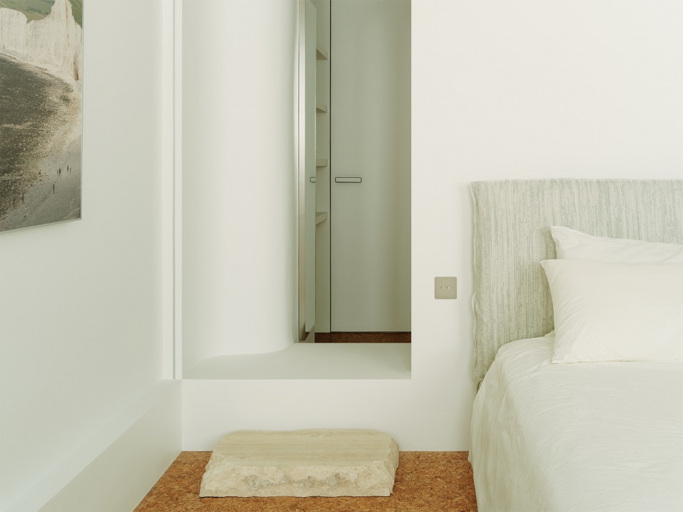 The master bedroom is organized with a dual-circulation layout, with the walk-in closet adjacent to and connected with two bathrooms, allowing residents to carry out their morning and evening routines smoothly and efficiently, minimizing waiting and detours. The natural texture and low-reflective surface of the cork soften harsh light, giving the bedroom a gentler brightness and a calm, inviting atmosphere.