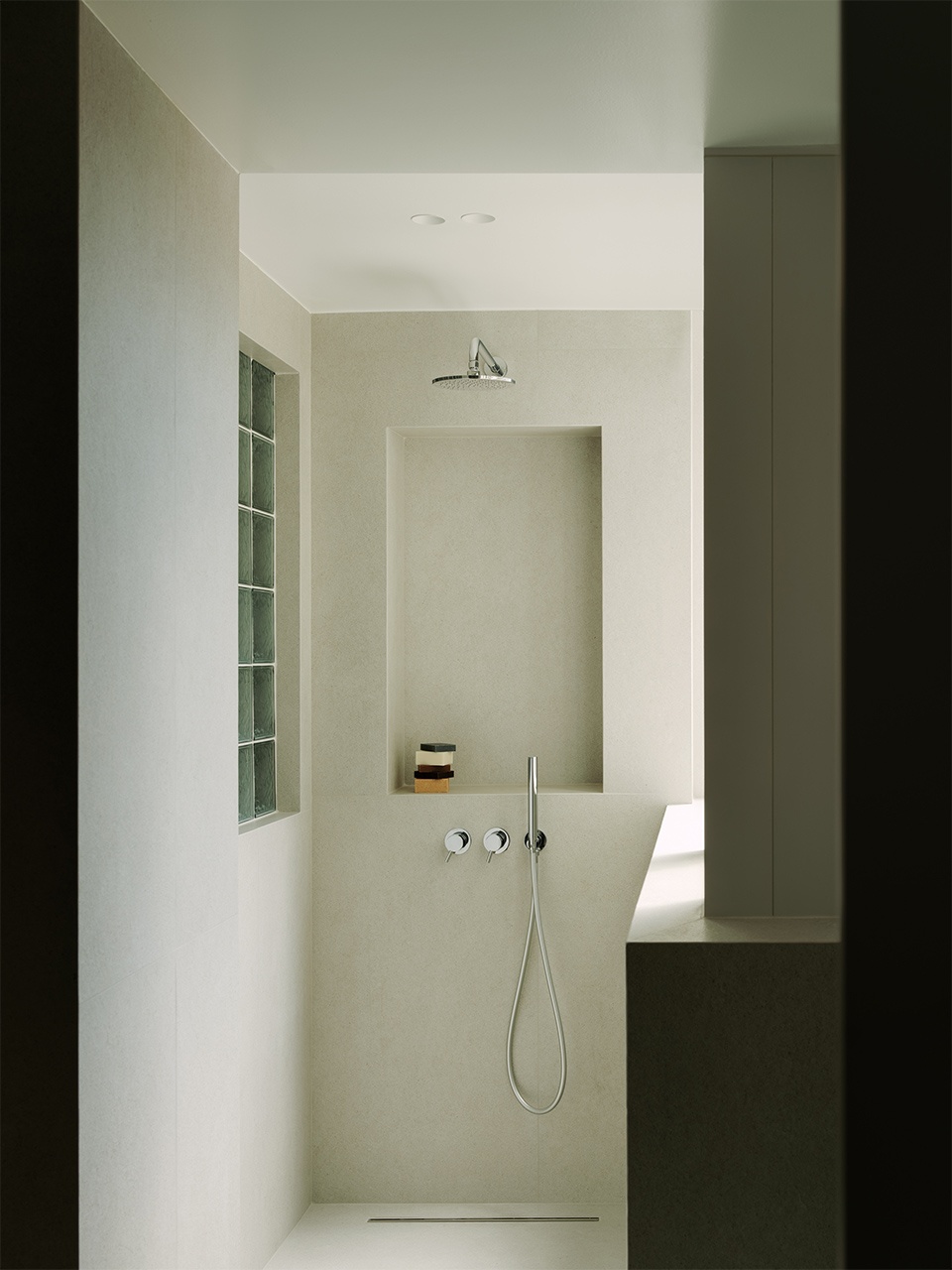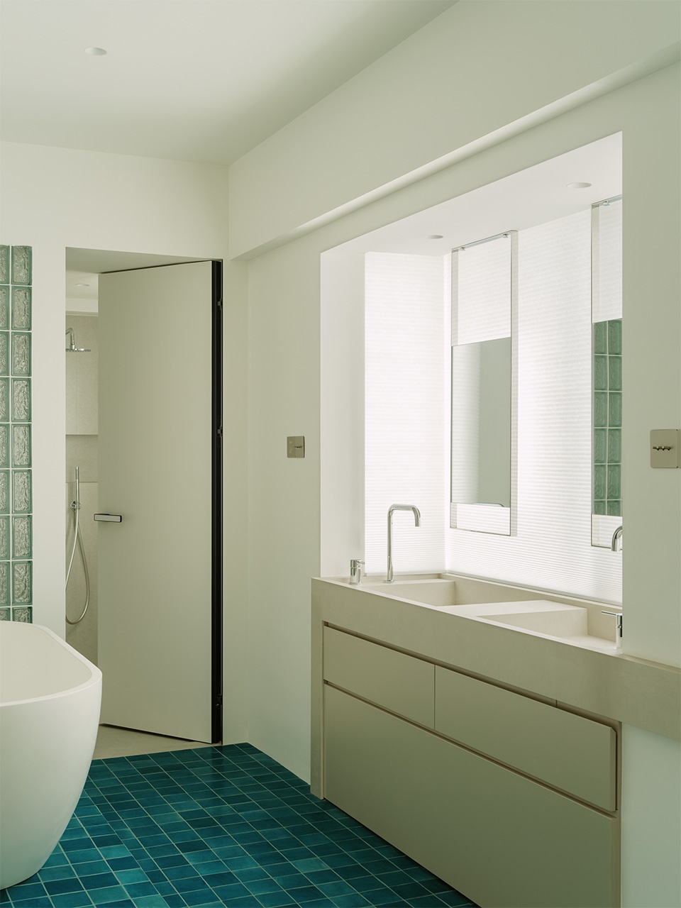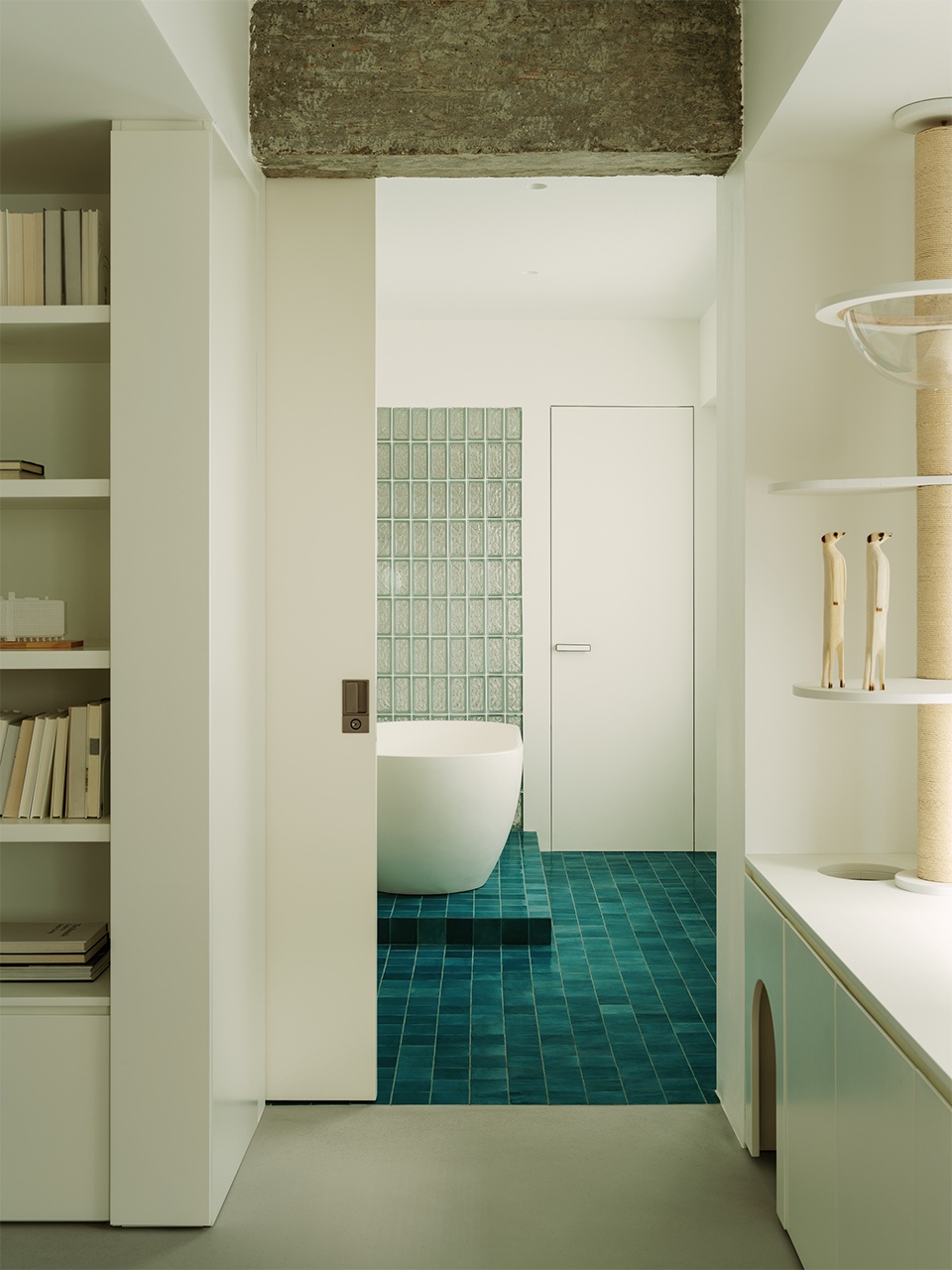 我们选择了软木、水泥自流平和瓷砖三种材质,使触觉与视觉皆参与空间感知。软木地板:用于静区,客厅地台与卧室的主要活动面,提供温润脚感并降低噪音。水泥自流平:覆盖于公共区域,如厨房、餐厅、客厅与书房,强调空间连续性与维护便捷,是高频活动区的理想选择。同时为空间带来冷静的整体性,让边界感更清晰。湿区材质对比:深蓝瓷砖与水泥自流平在浴室或功能交接处进行材质交错,增强分区感及视觉识别度。这些材质不仅作为视觉元素存在,更让居住者在行走、触摸、视觉中体验空间。