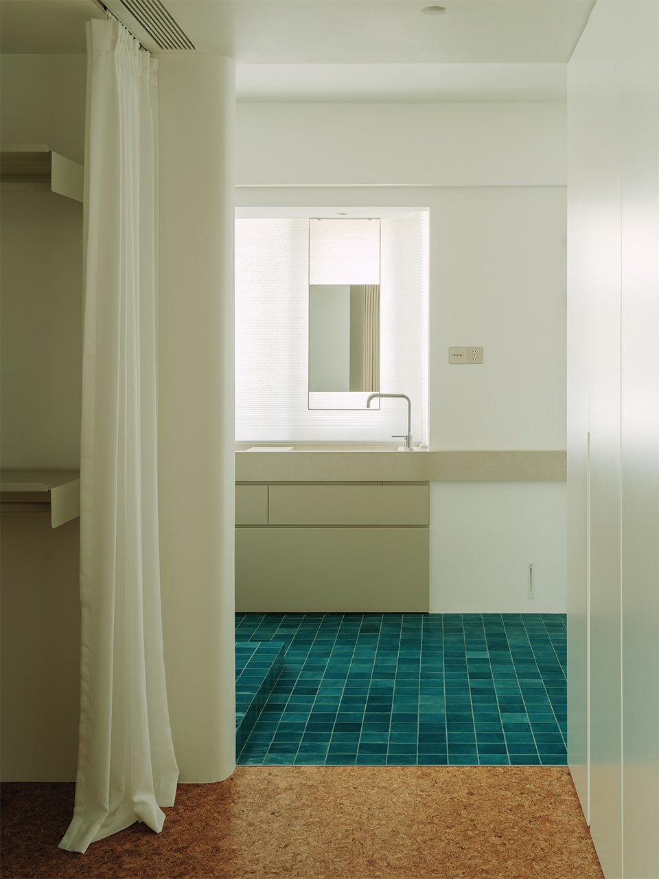 Three materials—cork, self-leveling cement, and tiles—were selected to engage both tactile and visual perception. Cork Flooring: Applied in quiet zones, on the living room platform, and the main activity areas of the bedroom, providing a warm underfoot feel while reducing noise. Self-Leveling Cement: Used across public areas such as the kitchen, dining room, living room, and study. It emphasizes spatial continuity and ease of maintenance, making it ideal for high-traffic zones. At the same time, it brings a calm cohesion to the space and clarifies boundaries. Material Contrast in Wet Zones: Deep blue tiles alternate with self-leveling cement in bathrooms or transitional areas, enhancing zoning clarity and visual legibility. These materials do more than serve as visual elements; they allow residents to experience the space through movement, touch, and sight.