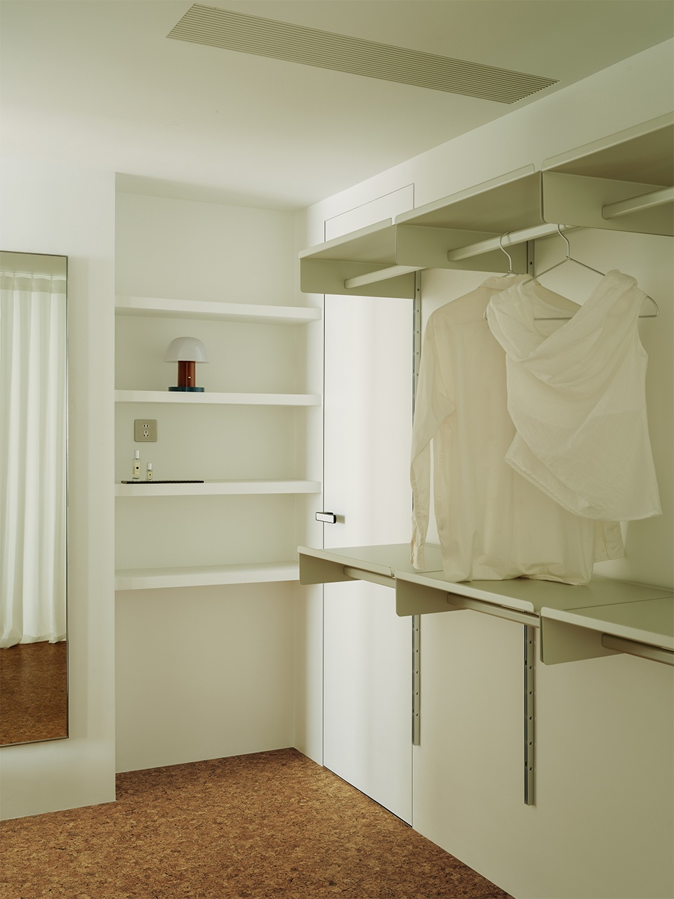 The walk-in closet is positioned between the bedroom and bathrooms, incorporating modular zones for hanging, folding, and everyday items, as well as a mix of open and closed storage. Open sections accommodate frequently used items, while closed cabinets store seasonal belongings. Visually, the closet extends the sense of the bedroom’s scale, and the use of consistent materials maintains a clean and cohesive aesthetic.