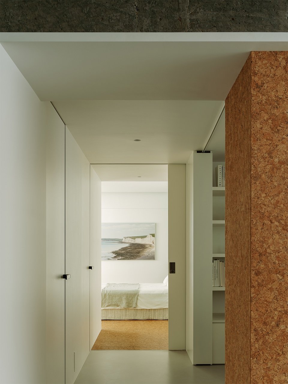 书房位于动区边缘,通过极窄边框室内窗和滑门与客厅相连。半开合界面支持在工作与互动之间自由切换,同时保持光线与视线的流动。焦糖色软木立面,营造柔和氛围,整个空间无踢脚线处理,收边无缝衔接,完整统一。