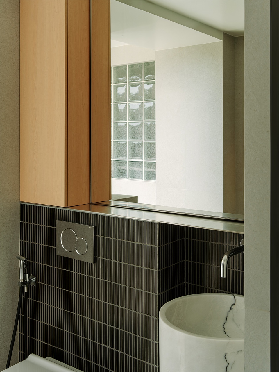 客卫采用分离式布局,借由材质的对比明确干湿分区,加上柔和的光线,使小尺度空间保持明快与通透。
