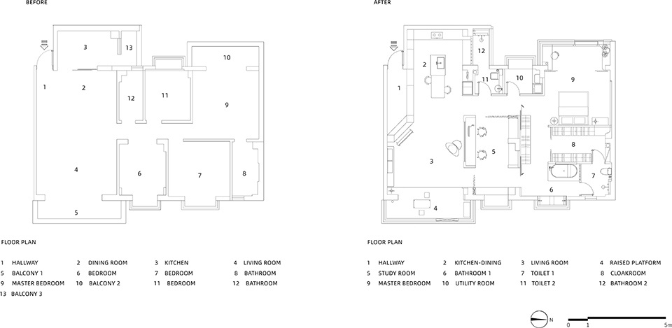 项目位于深圳市宝安区,建筑面积140m²,钢筋混凝土结构。业主是一对建筑系毕业的年轻夫妻。对空间形式持有敏锐的感知和开放的态度。他们期望住所既安定松弛又不显冷淡。避免过度的设计干扰,保留生活的呼吸感。改造的目标是将“琐碎零散的空间”变成“有序、可感知、可掌控的生活场域”,让家的气质和生活节奏达到统一。