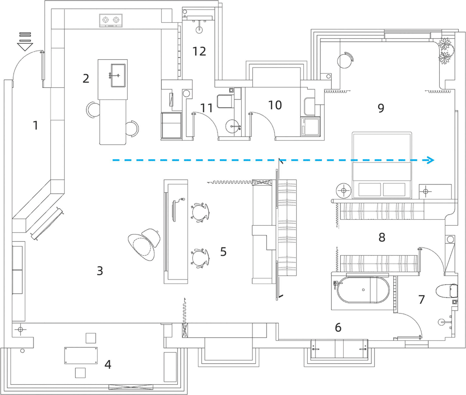1·空间布局采用动静分离策略:左侧为动区(厨房/餐厅/客厅/书房),动线短平直,方便多人同时使用。右侧为静区(主卧/衣帽间/卫浴),形成独立的休憩区域。
