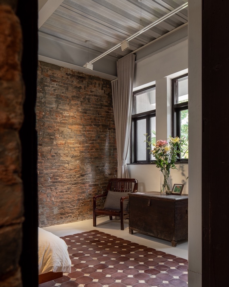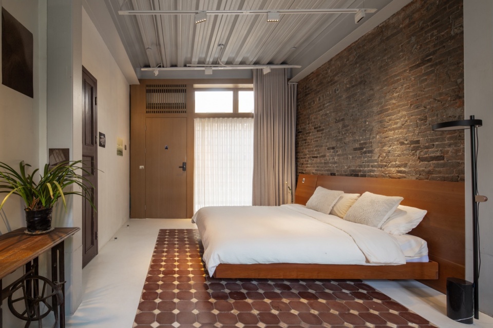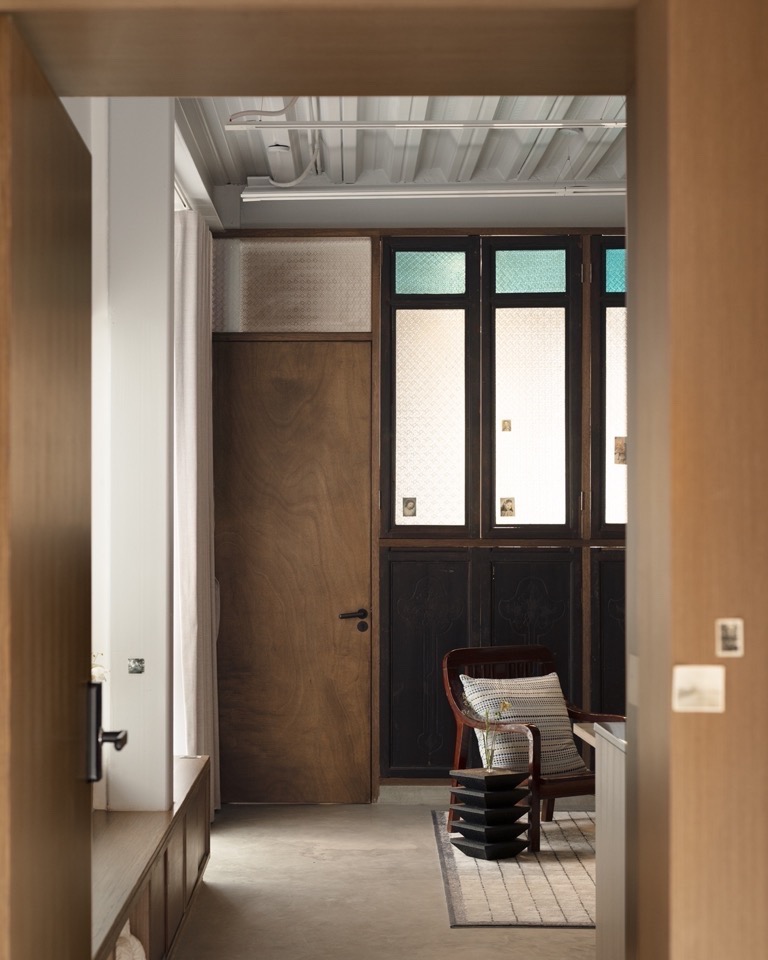 Hosting guests are a means for Building narrative to share design work and memory of Xiguan with guests. Two apartments are located above the workshop. They are accessed by a dedicated door at the street and are designed as guestrooms when unoccupied by the family. Inside the apartments finishes and furnishings are currated to describe Xiguang culture. Original floortiles have been repurposed as wall tiles in the washrooms. Some stained glass is installed again as interior screens. Guests are free to use original dinnerware.