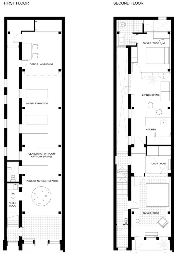 With a 4.5m tall ground floor and open plan, the workshop is suited to host exhibitions, beginning with Artist Justin Hui’s site specific installation, Searching for Poon. The exhibition will be available from August 9-December 1, 2025. A small mezzanine floor is designed to host overnight stays for colleagues traveling from Hong Kong.
