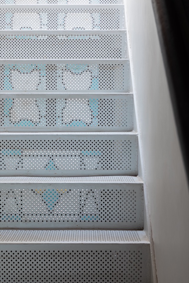 以“太阳烟囱”实现被动通风,建筑最尾端的天井贯穿楼层,在夏季风向引导下,热空气在此垂直空间上升,引导街道凉风进入,实现屋顶排热。这一设计在混凝土楼梯上方也被再次运用。金属楼梯以穿孔设计允许热空气上升至屋顶梯间。在两处“太阳烟囱”中,均配备传感器控制的机械风扇,于高温与高湿时自动启动,以增强通风效能。