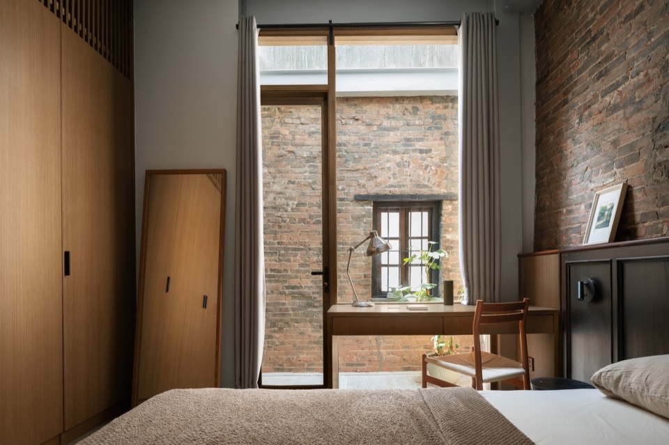 结构层面的“置换”也显而易见。虽然原有砖墙被保留,新建钢架结构则承担屋顶与楼板的支撑功能。新的钢结构并未完全贴合原砖墙之间的空间,从主卧室望向北墙时,所见的缝隙仿佛时间的裂痕——原始建筑与新介入之间的距离。这段“空隙”,也正是光照进入的路径。